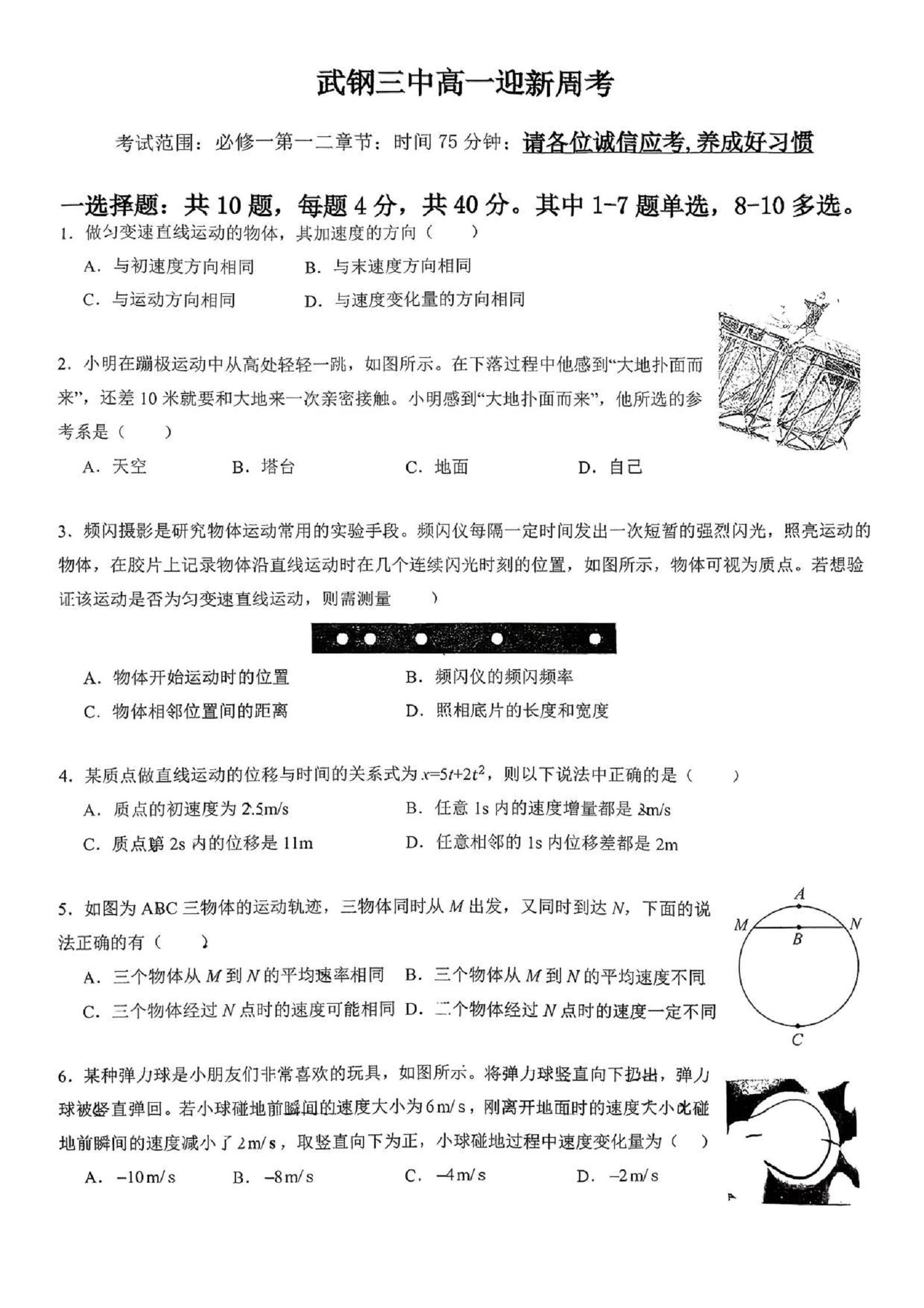 武钢三中2025秋高一物理迎新周考试题(PDF版)