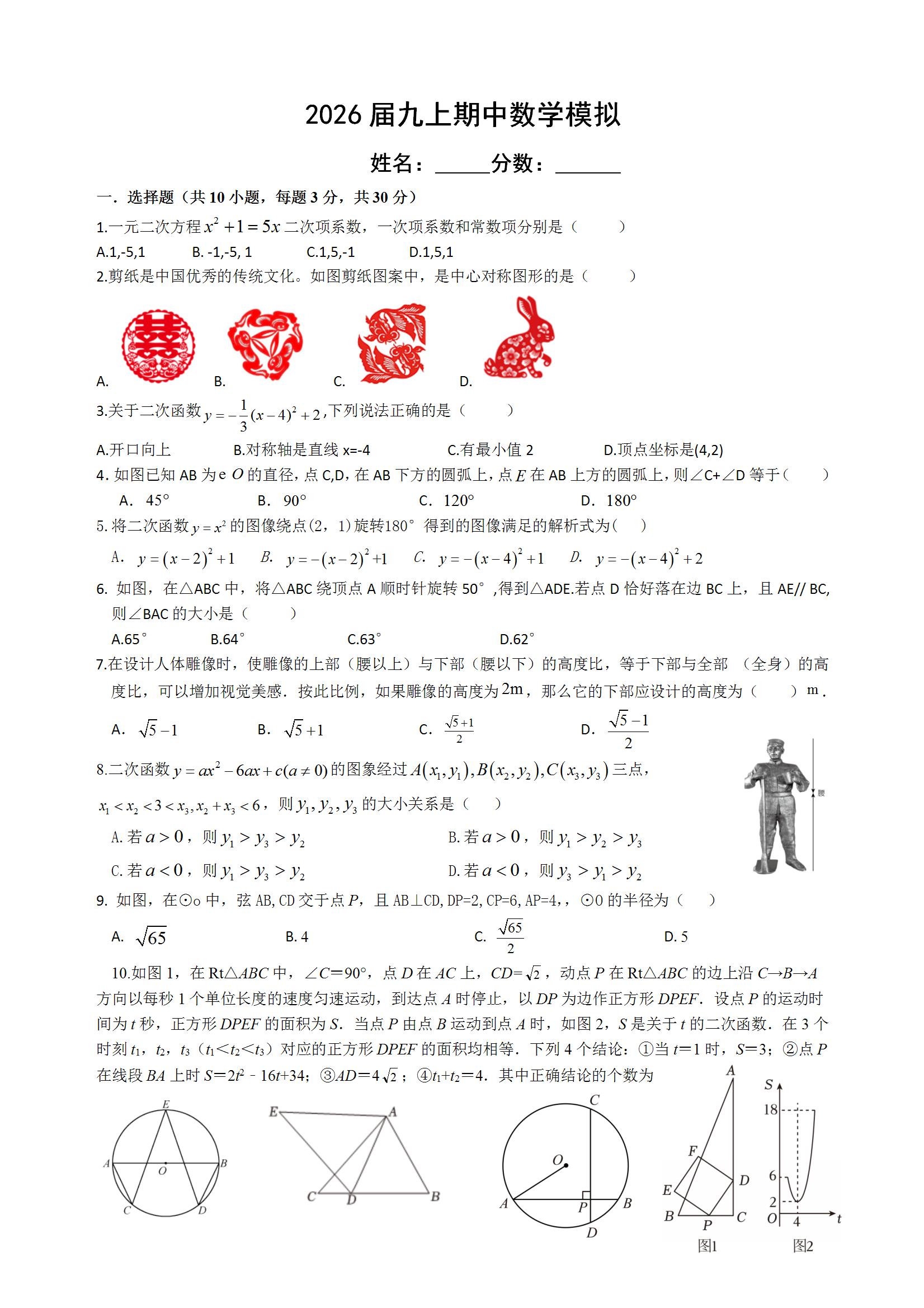 武汉市英格中学2025-2026学年上学期期中模拟九年级数学试卷(word版)