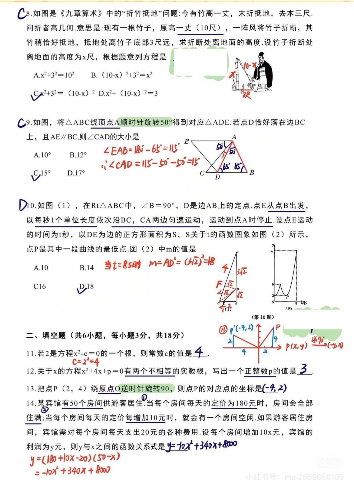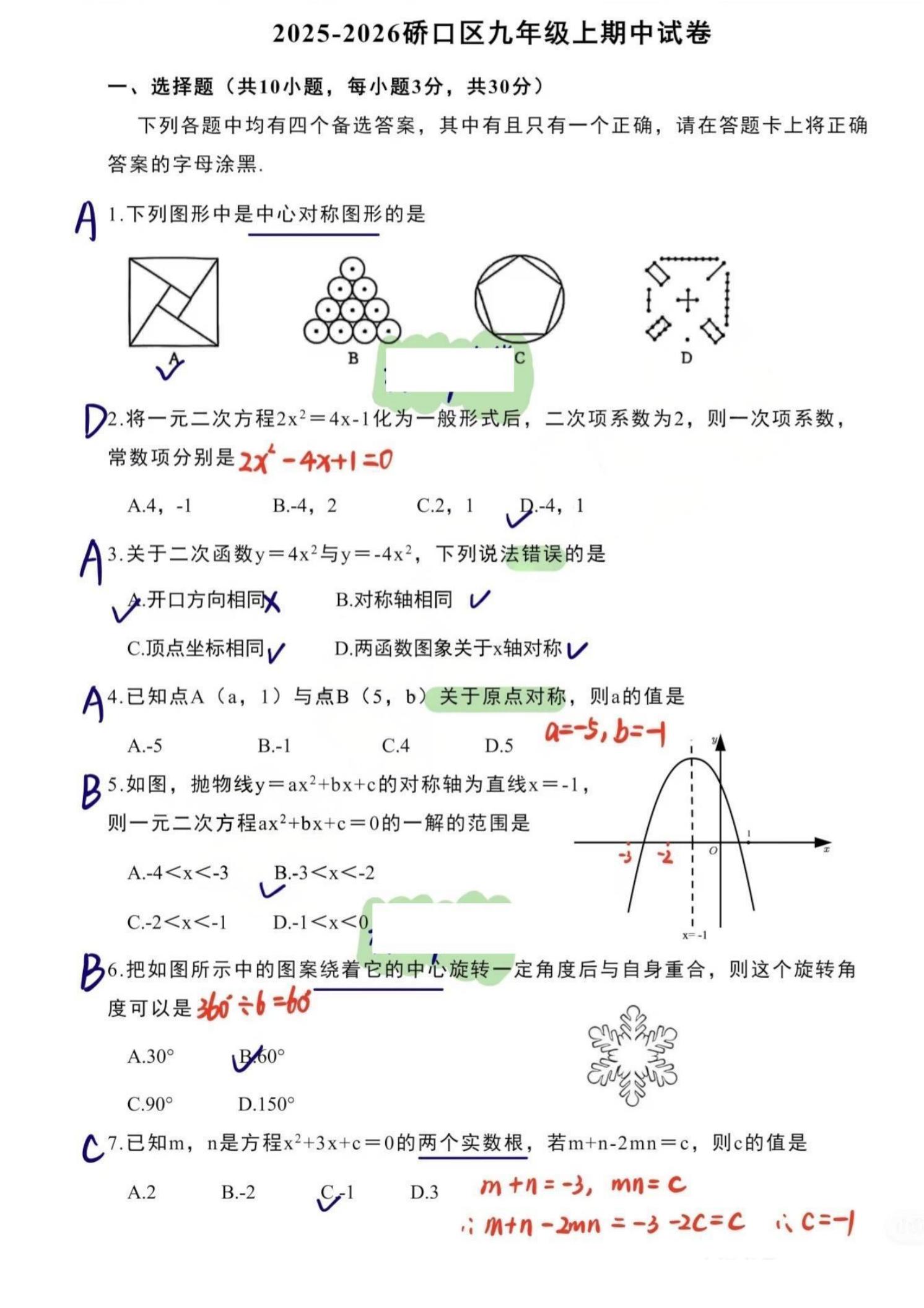 硚口(经开)区2025-2026学年上学期期中九年级数学手写答案