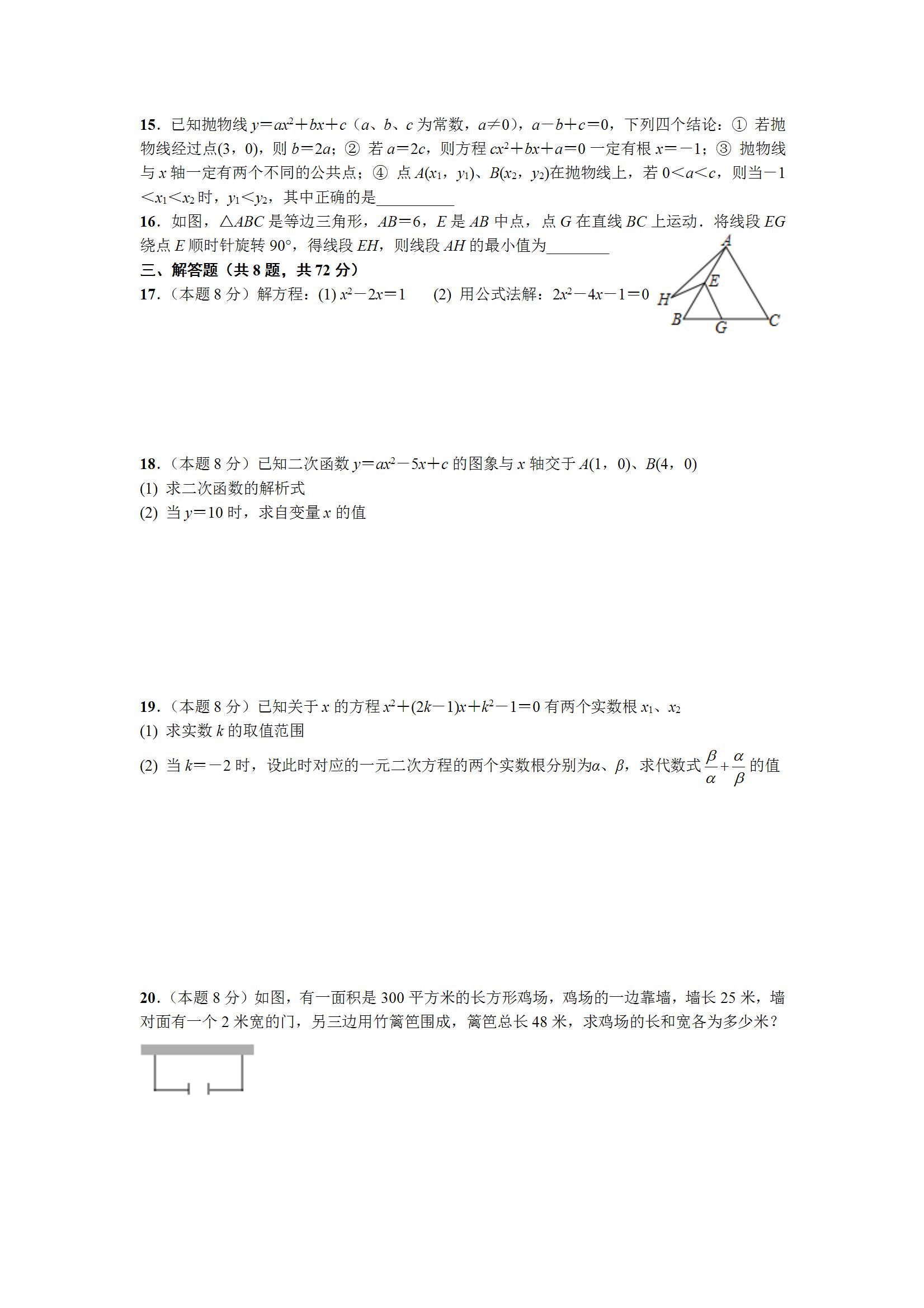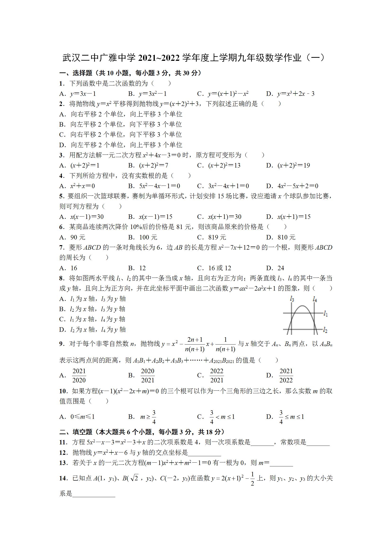 武汉二中广雅中学2021-2022学年度九上数学集体作业(一)(word版)