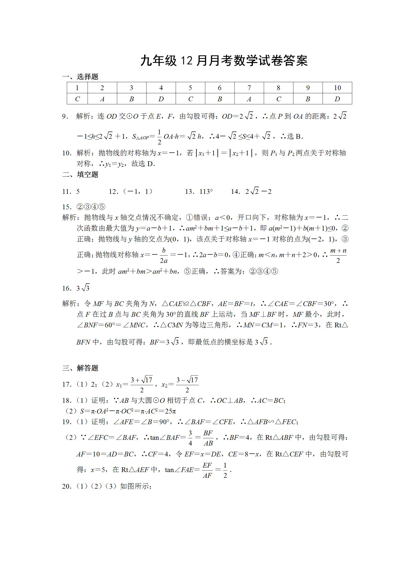 武汉一初慧泉2021-2022学年度12月考九年级数学同步练习参考详答