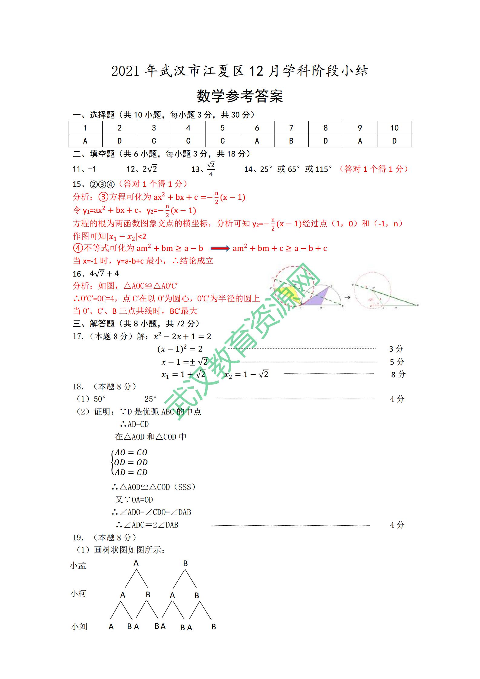 江夏区2021-2022学年上学期12月考九年级数学参考答案及评分标准