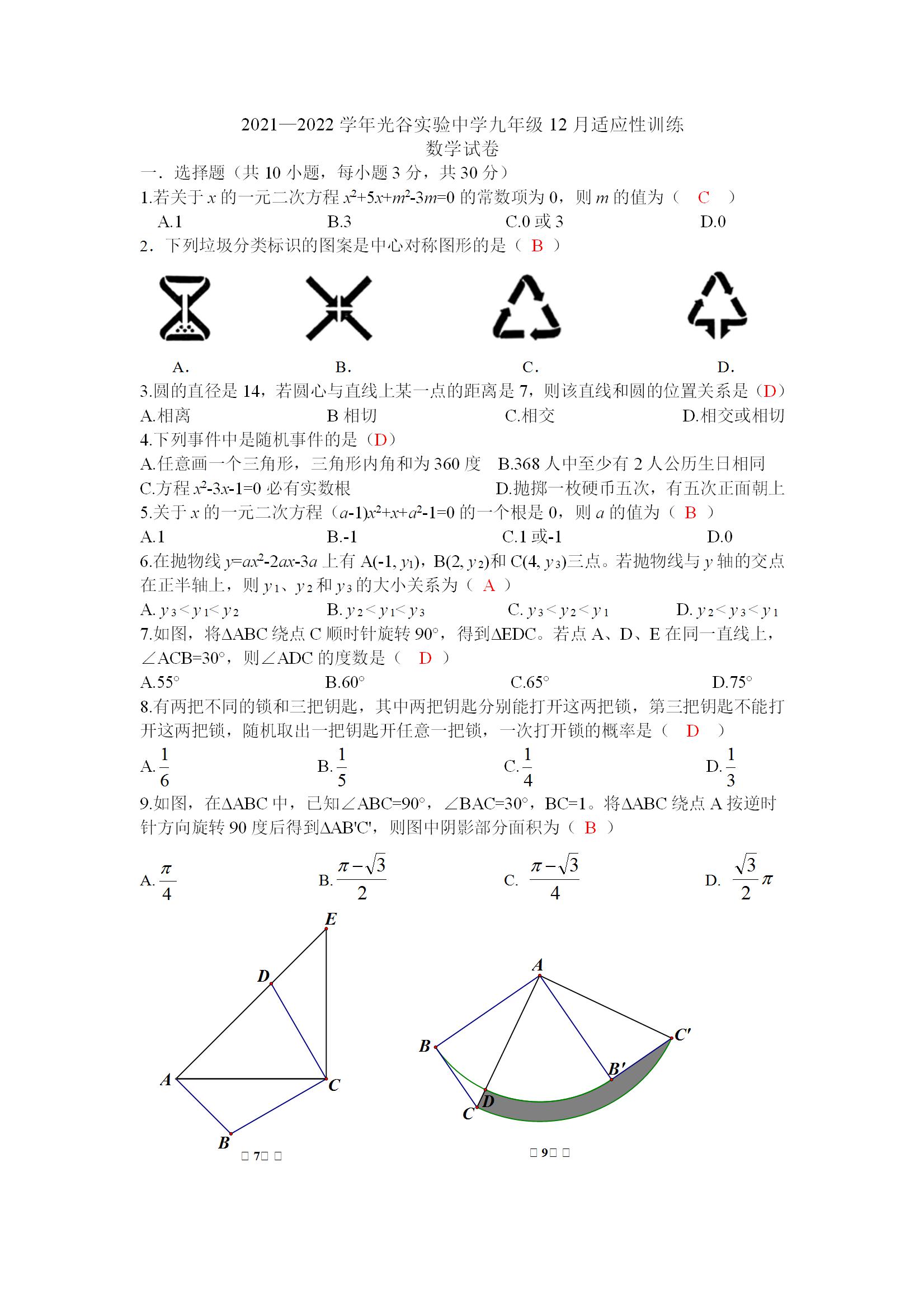 (更正版)武汉光谷实验中学2021-2022学年度12月月考九年级数学试题(word版含答案)