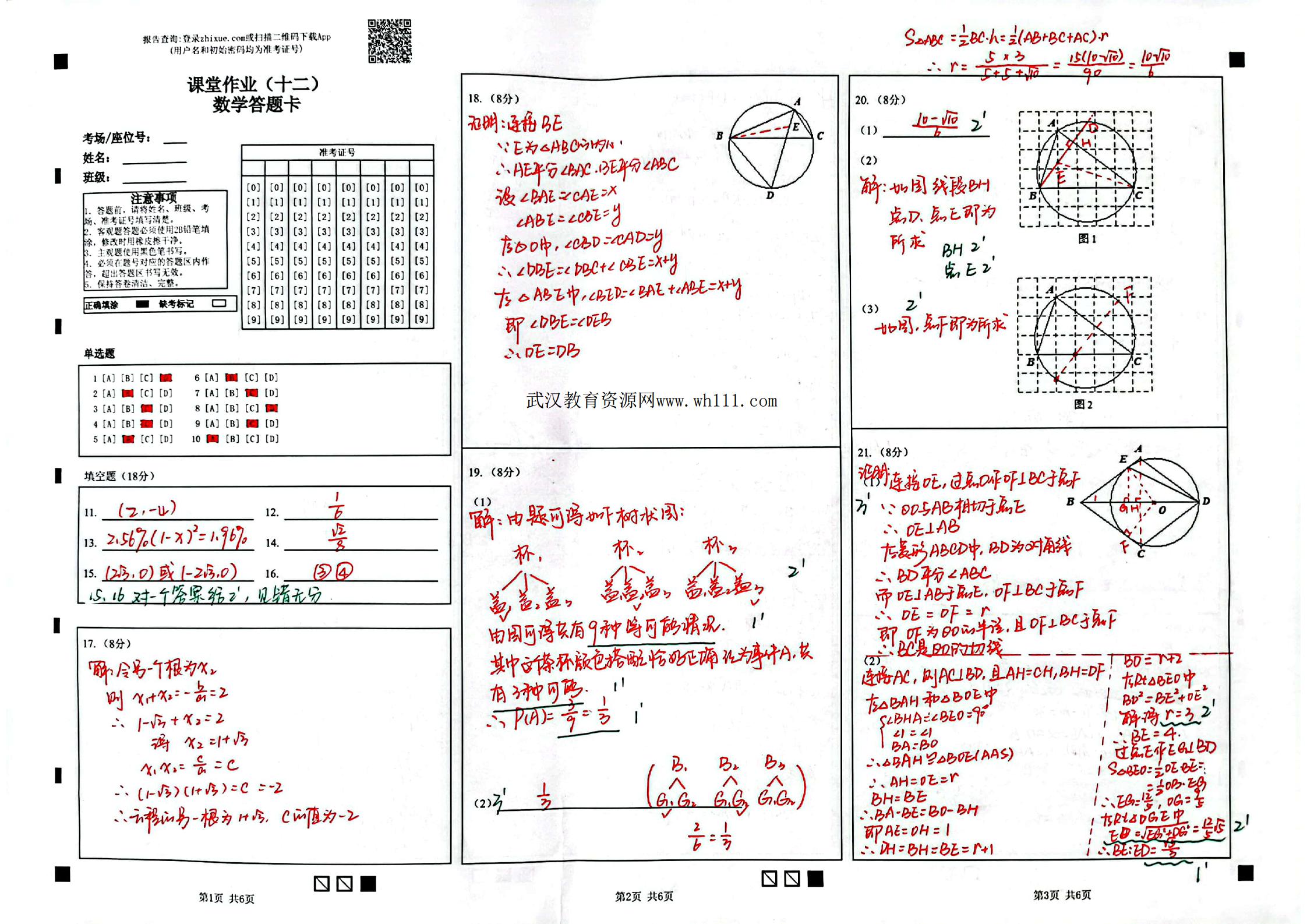 武汉六初2021-2022学年上学期12月九年级数学课堂作业参考答案