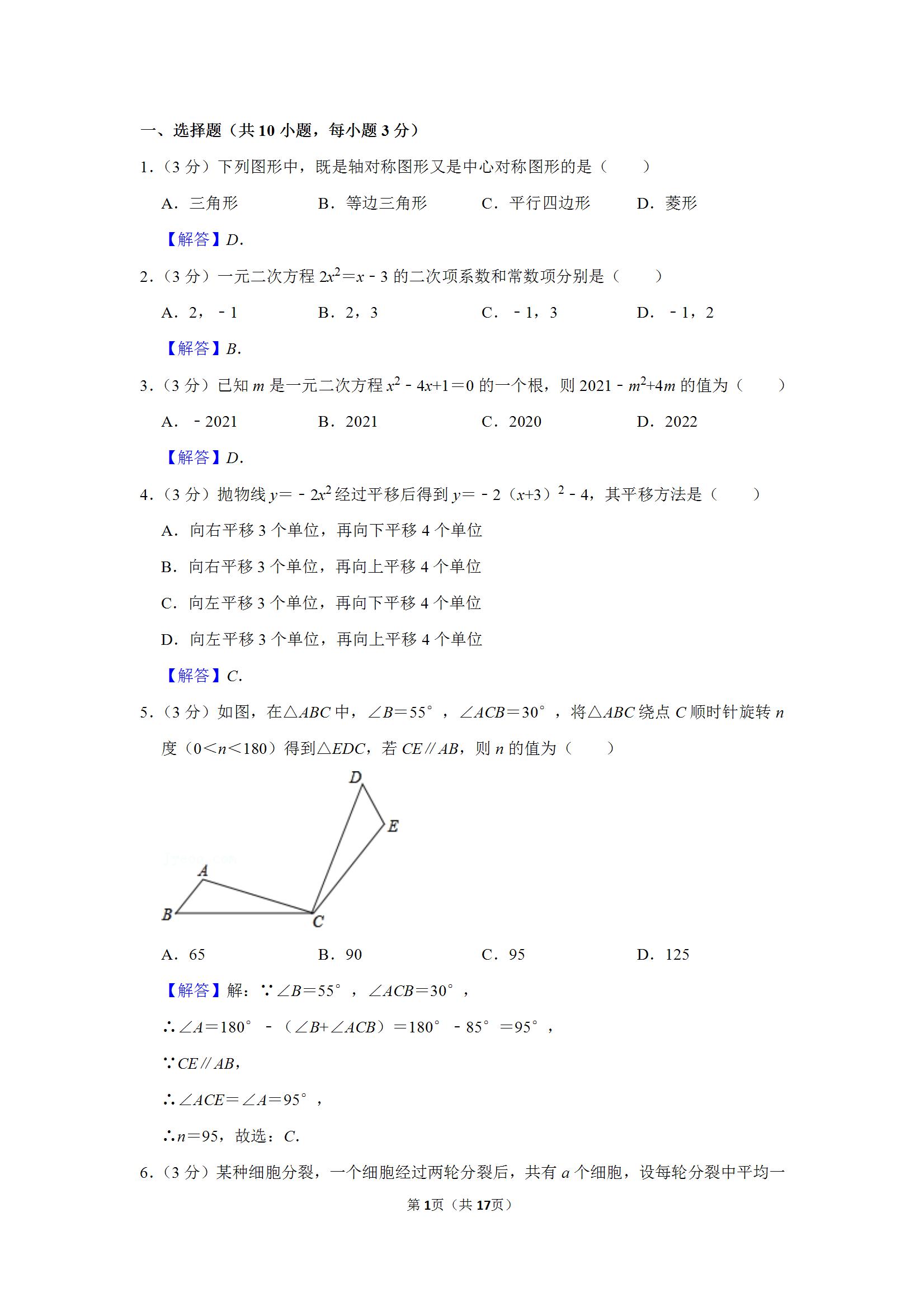 、武汉一初慧泉2021-2022学年度10月九年级数学试题(解析版)