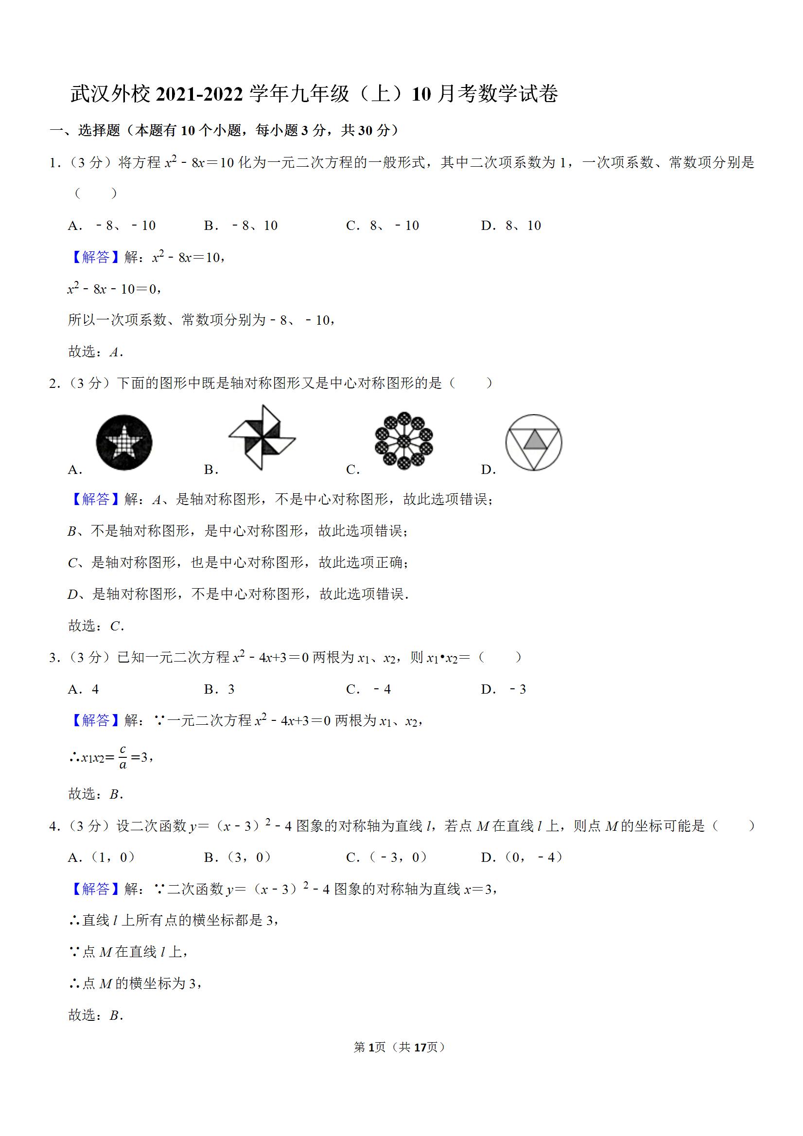 武汉外校2021-2022学年九年级(上)10月考数学试卷(解析版)
