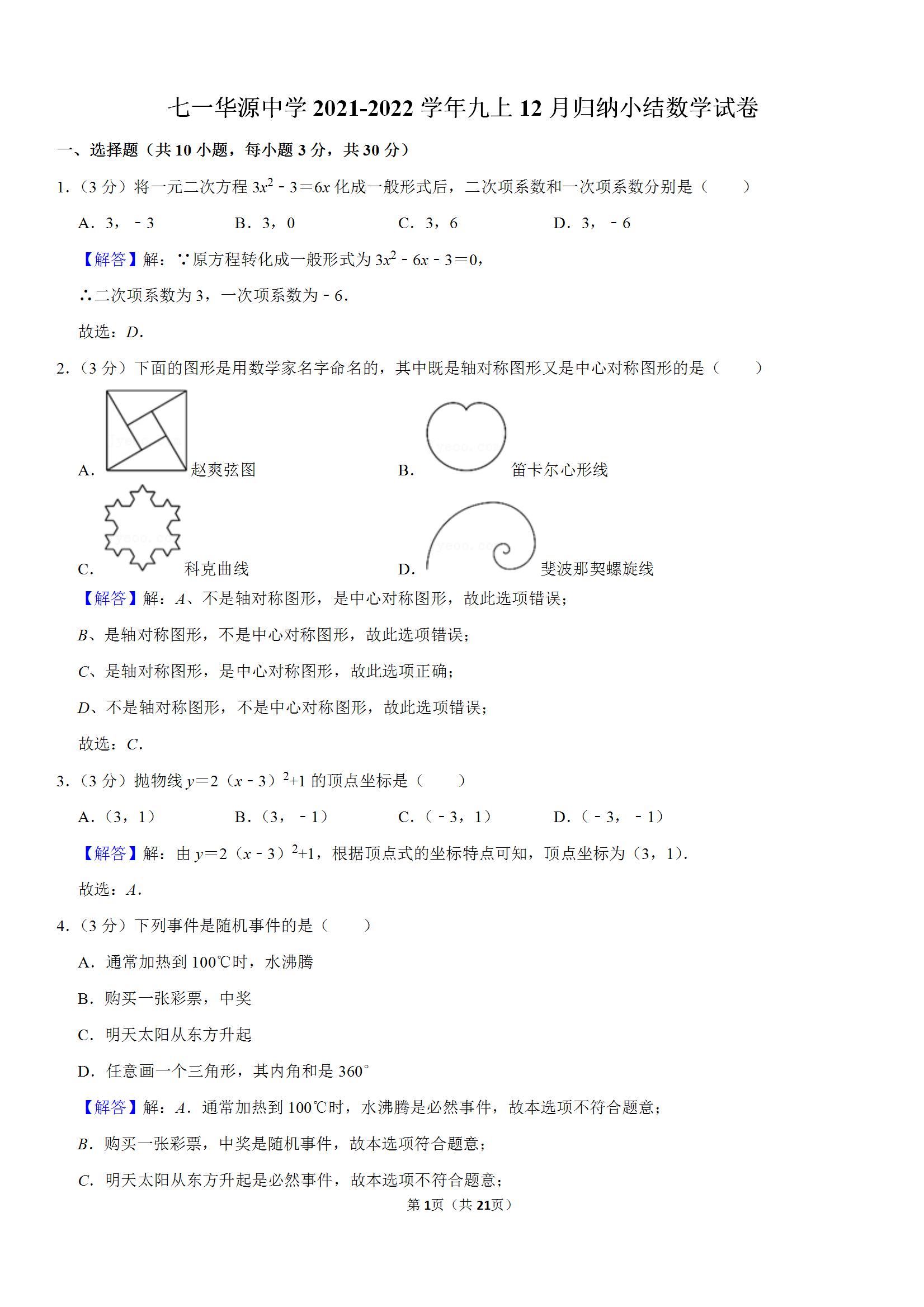 七一华源中学2021-2022学年九上12月归纳小结数学试卷(解析版)