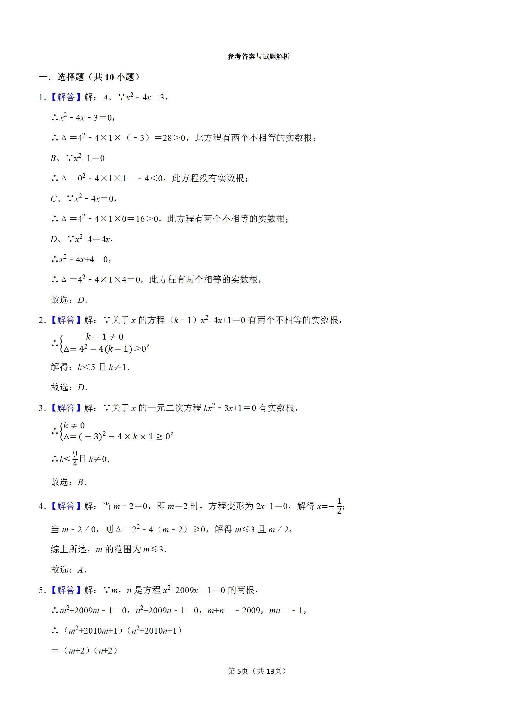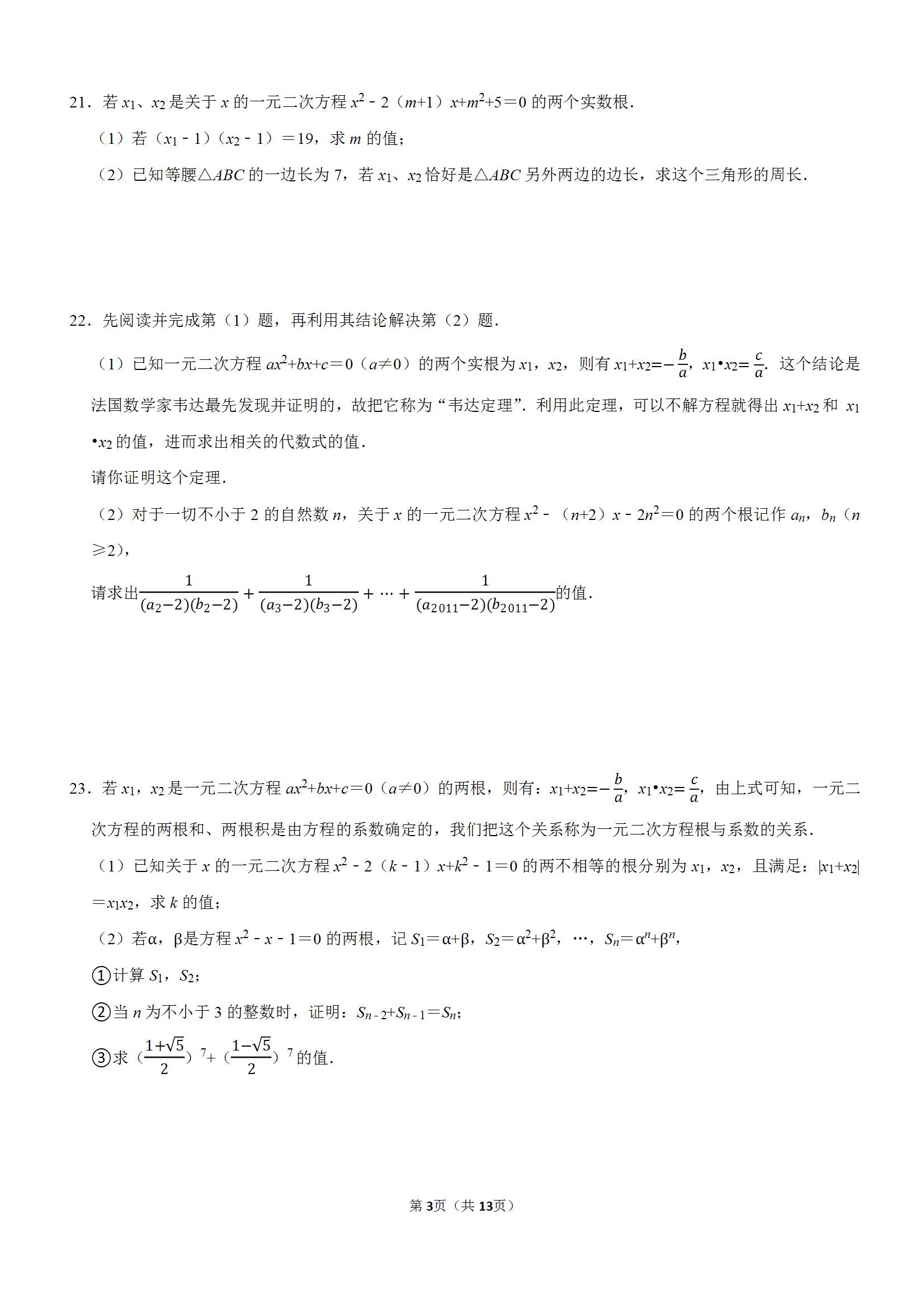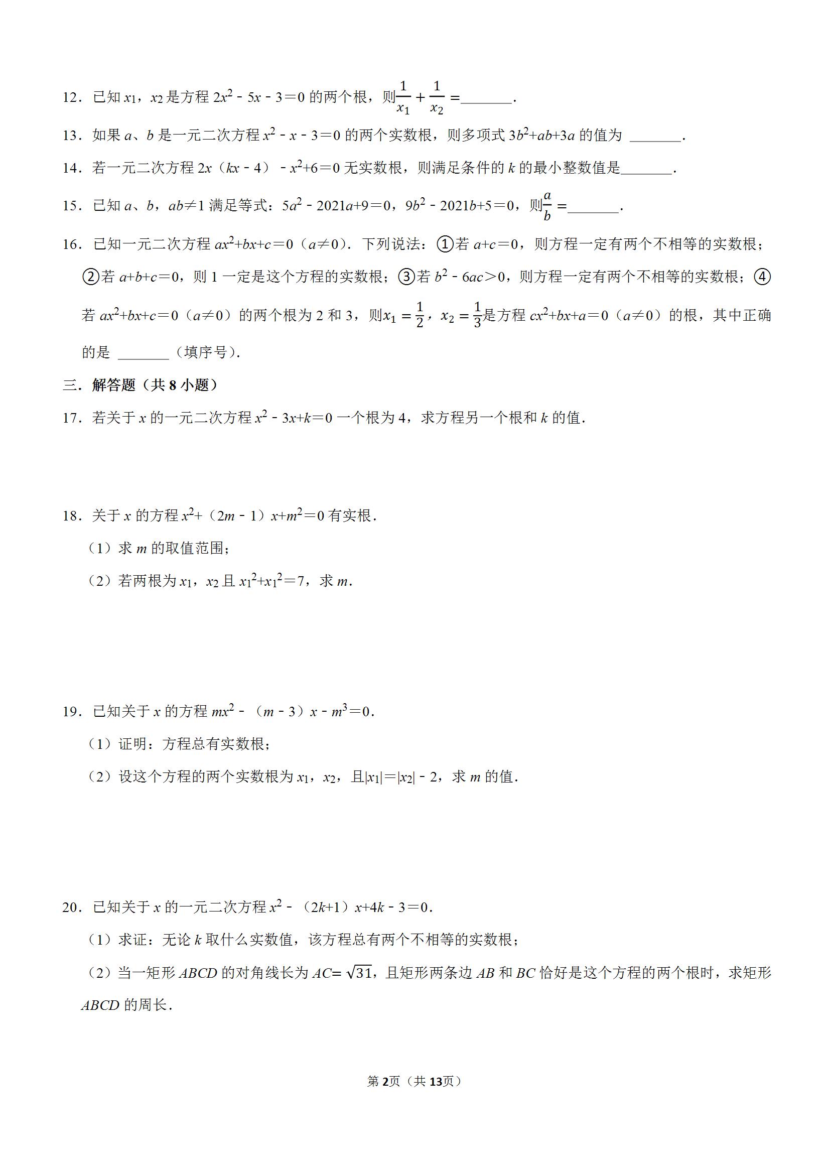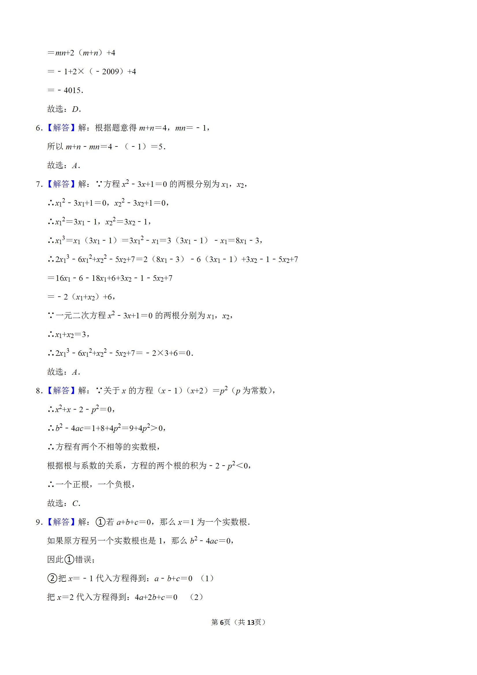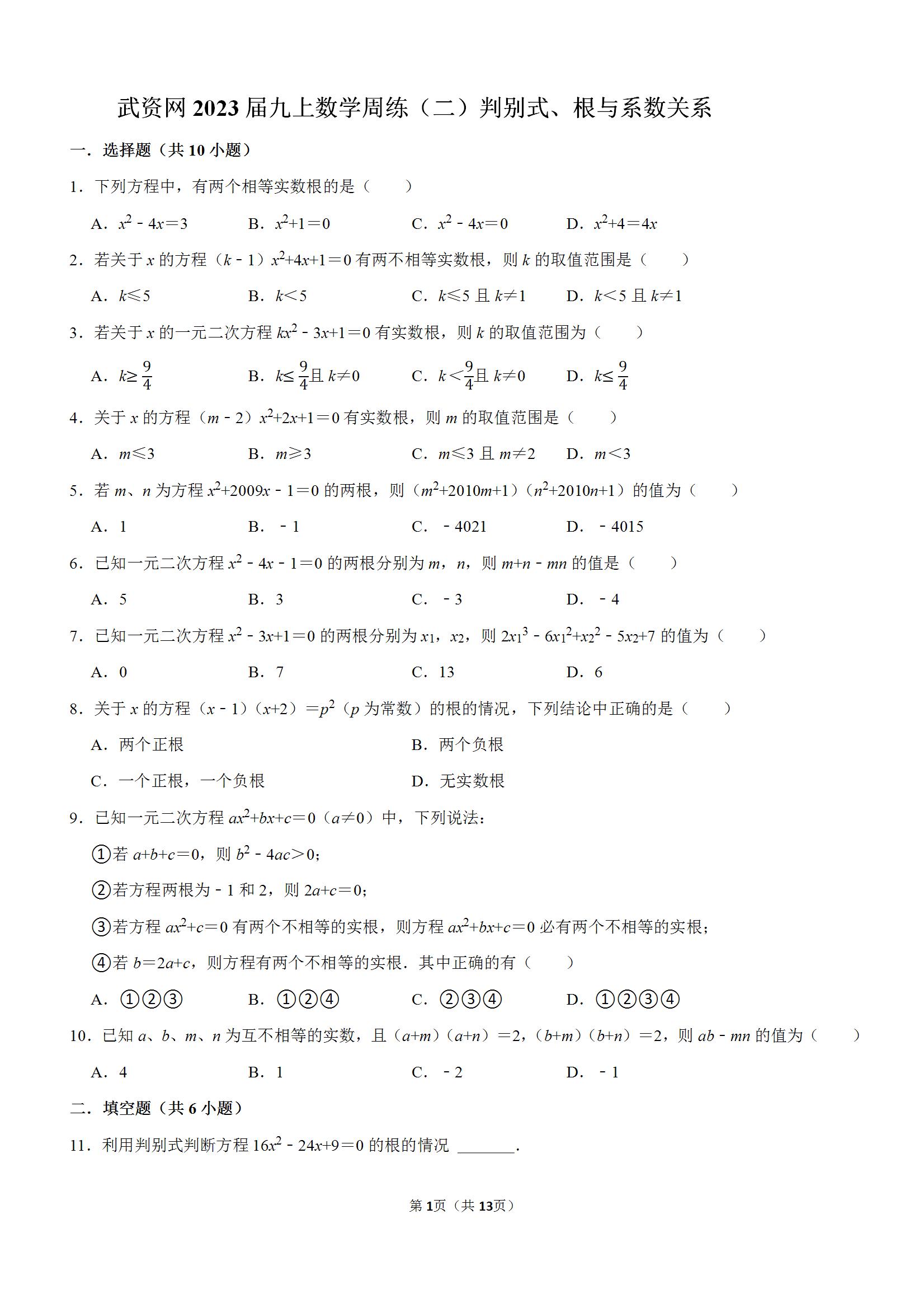 武资网2023届九上数学周练(二)判别式、根与系数关系