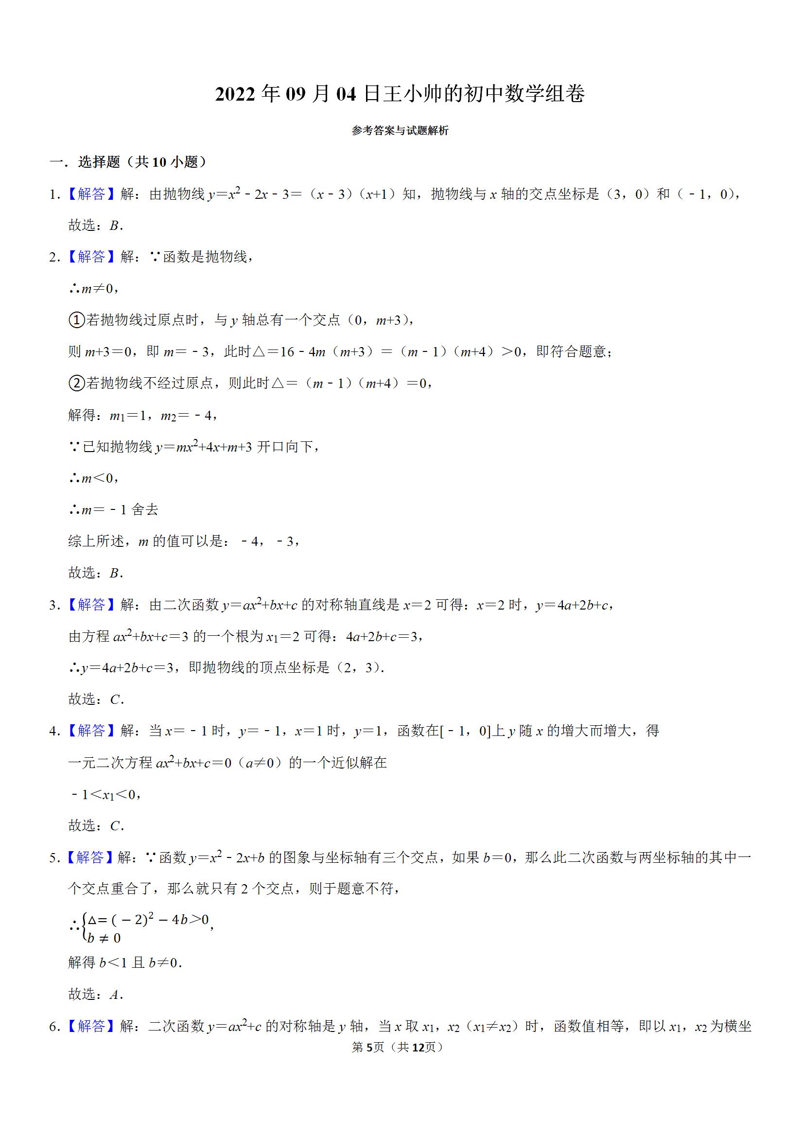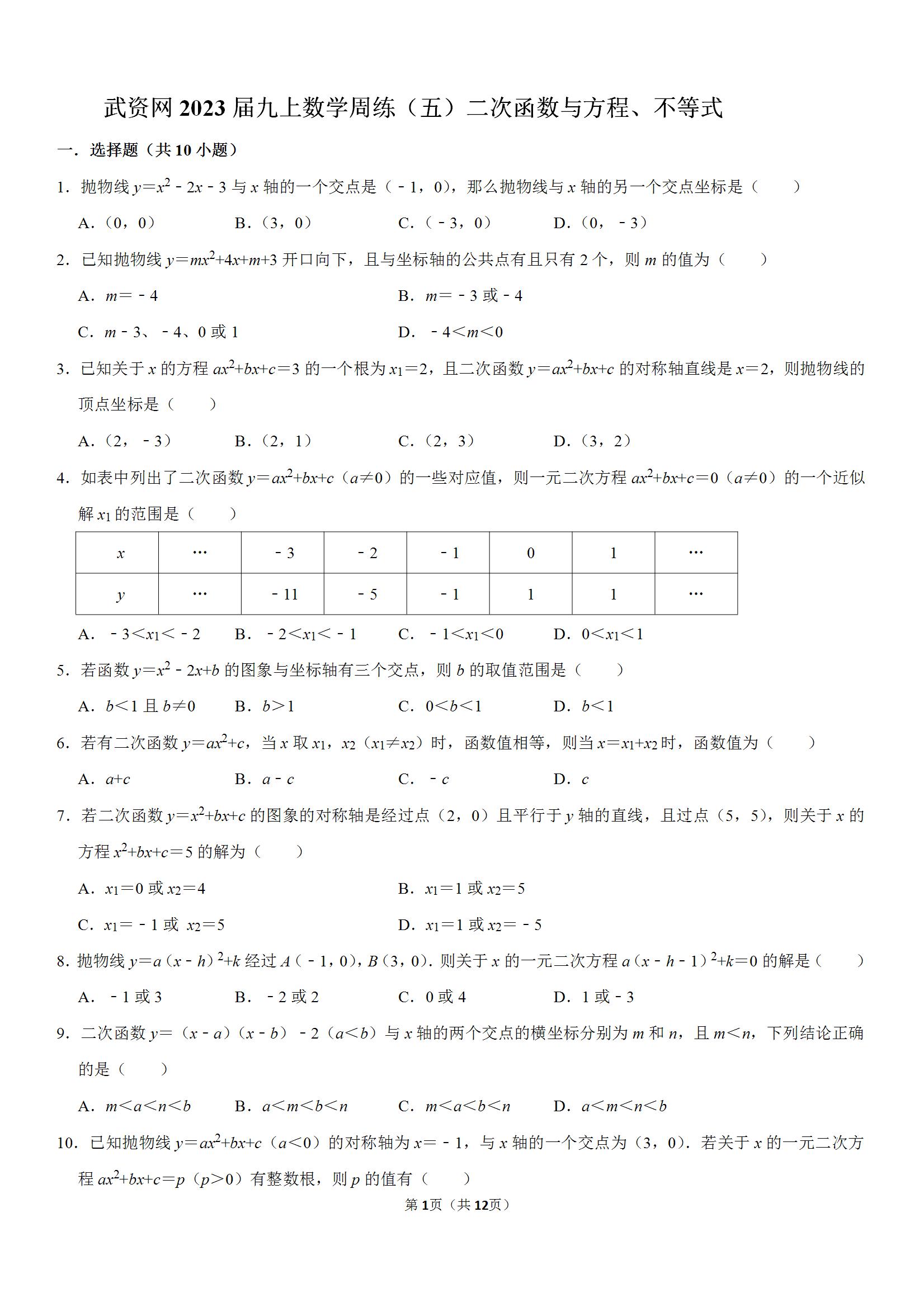 武资网2023届九上数学周练(五)二次函数与方程、不等式(word版含答案)