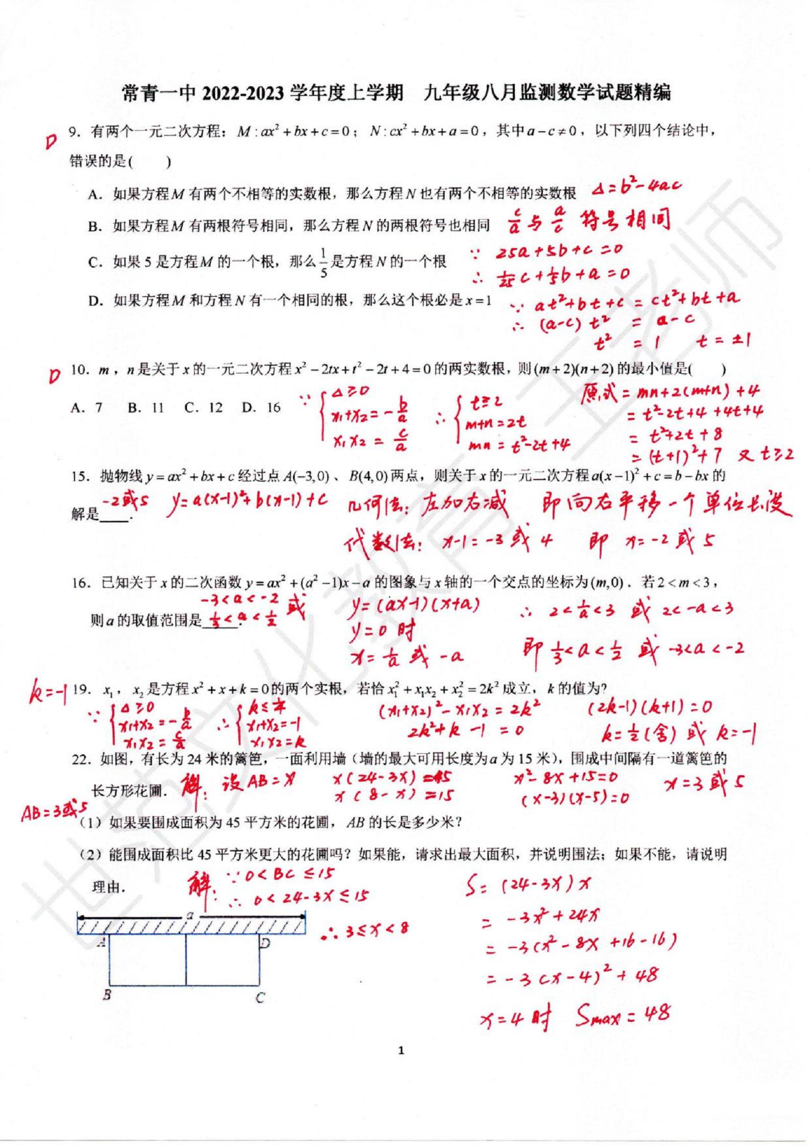 武汉市常青一校2022-2023学年上学期八月质量监测九年级数学参考答案
