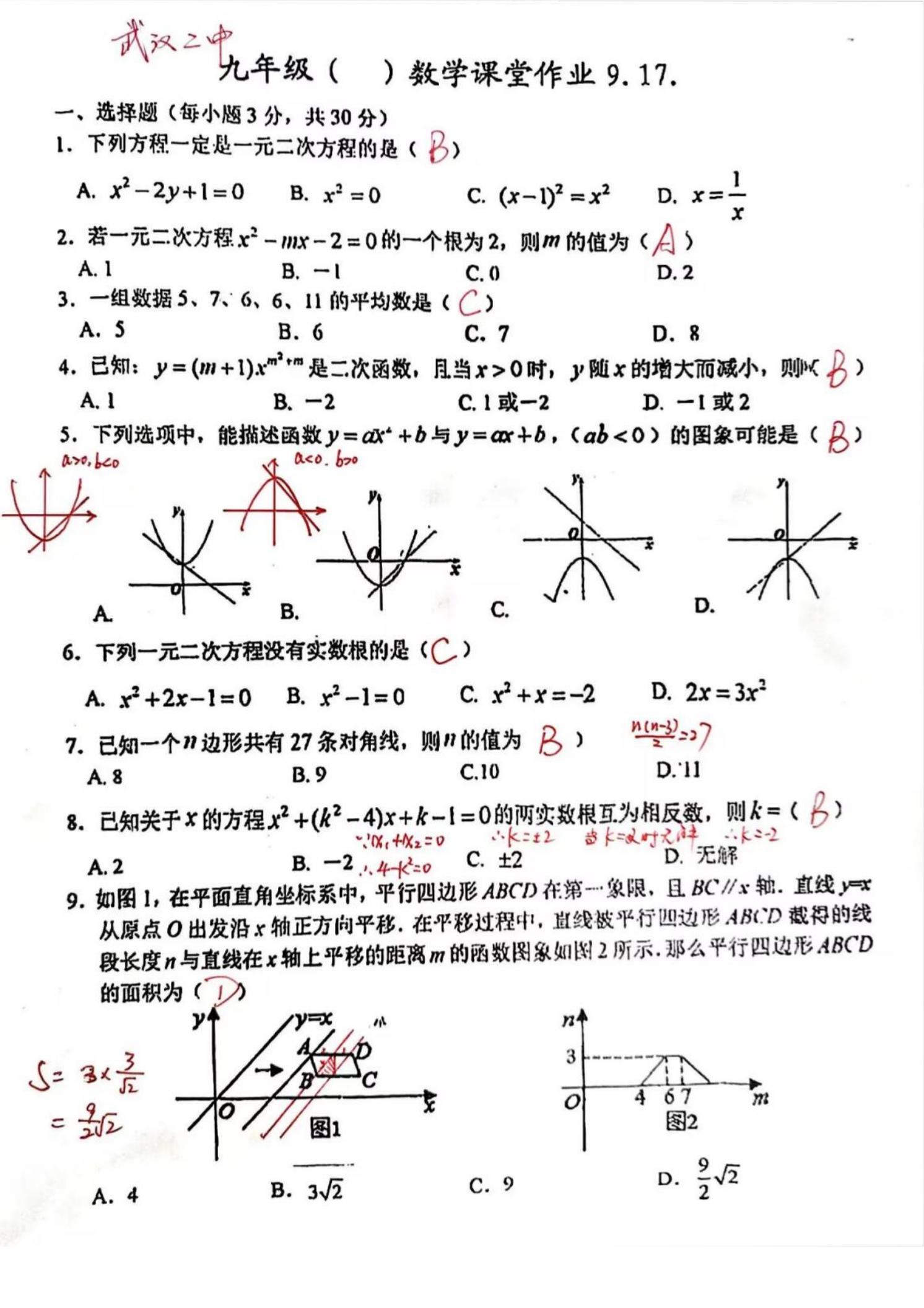 武汉二中广雅中学2022-2023学年上学期九年级数学课堂作业(一)9.17(word版)