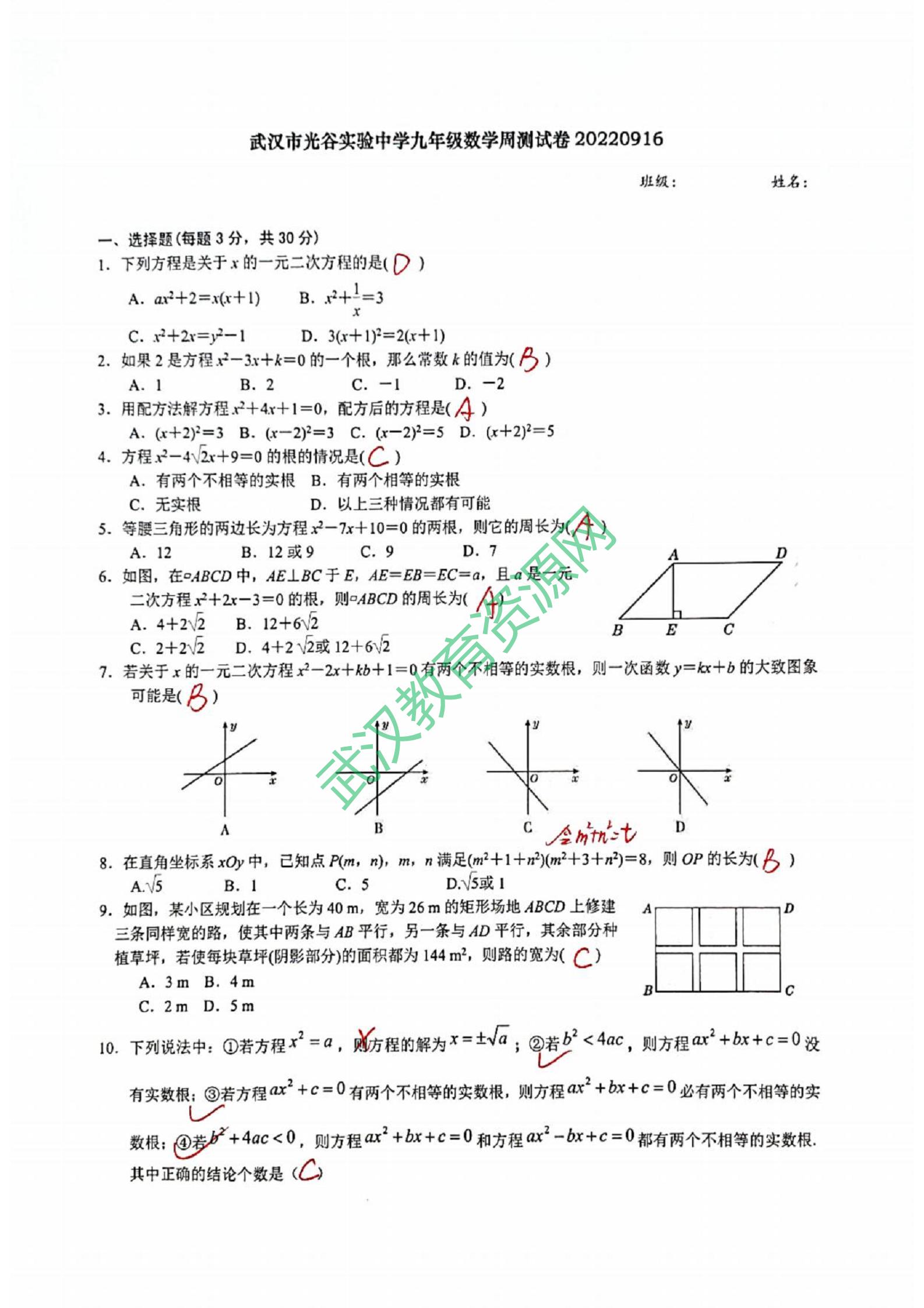 武汉光谷实验2022-2023学年度上学期九年级数学周测试题9.16(word版)