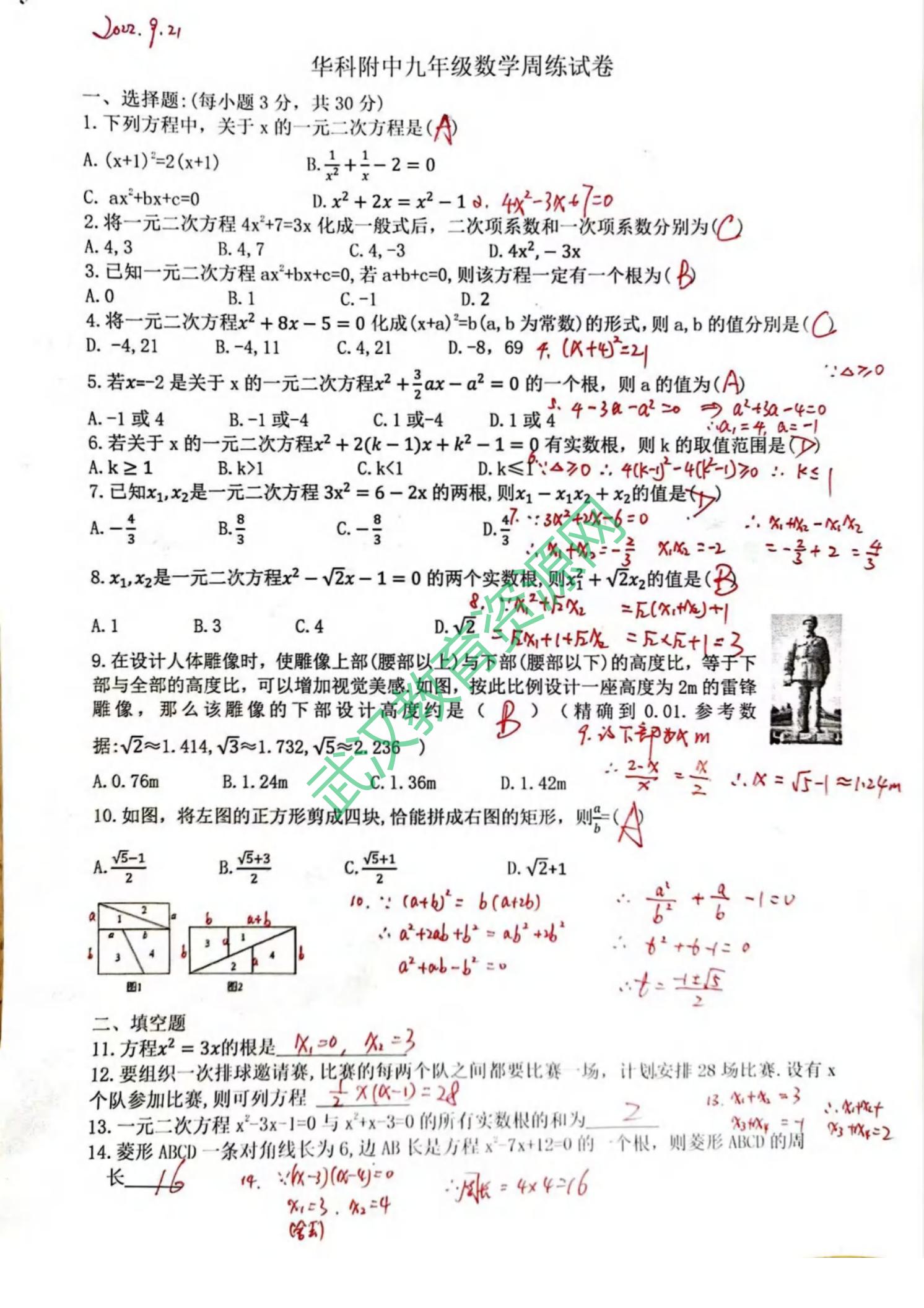 华科附中2022-2023学年度上学期9月九年级数学参考答案