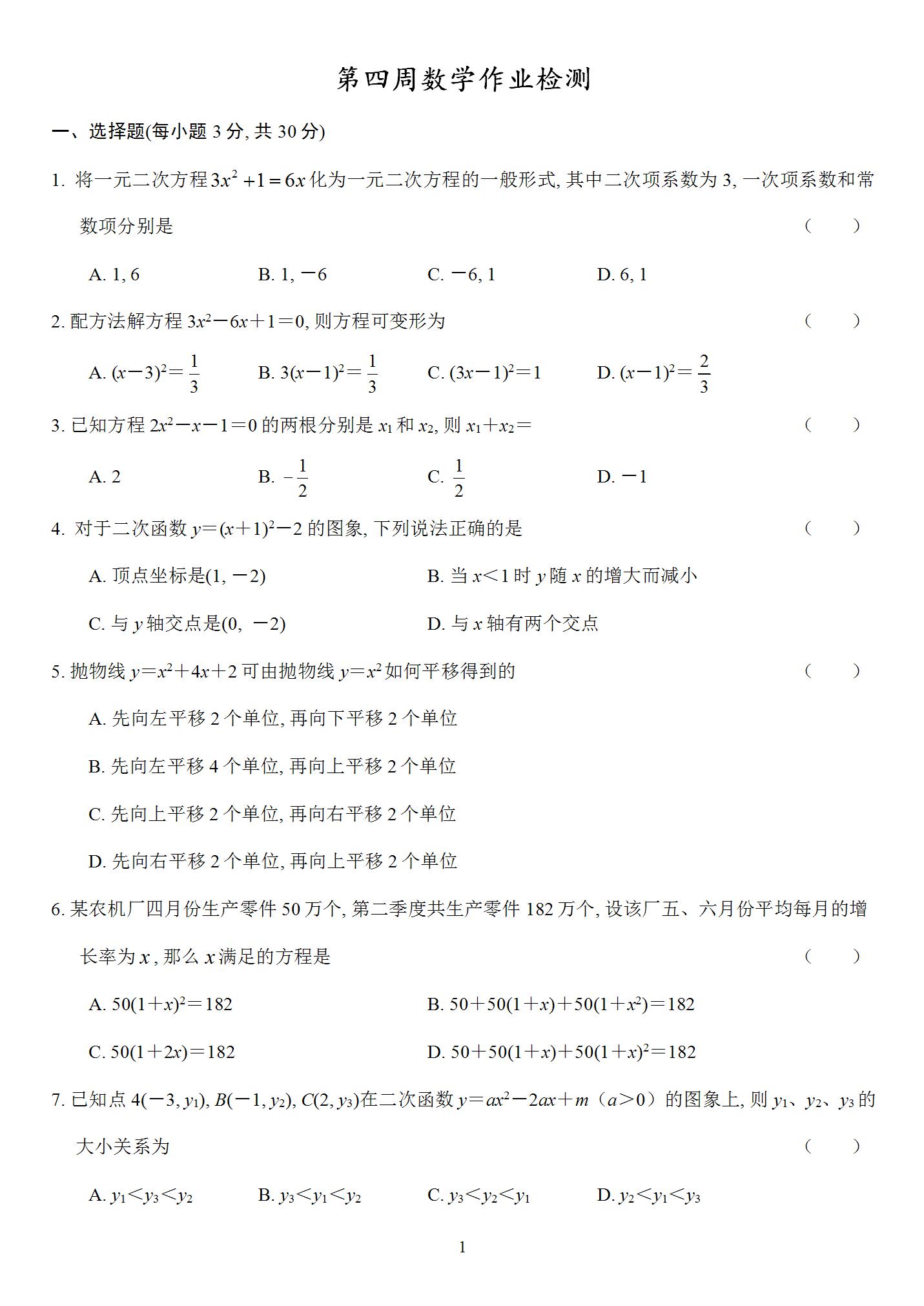 七一华源2022-2023学年九上数学作业检测周练四(word版)