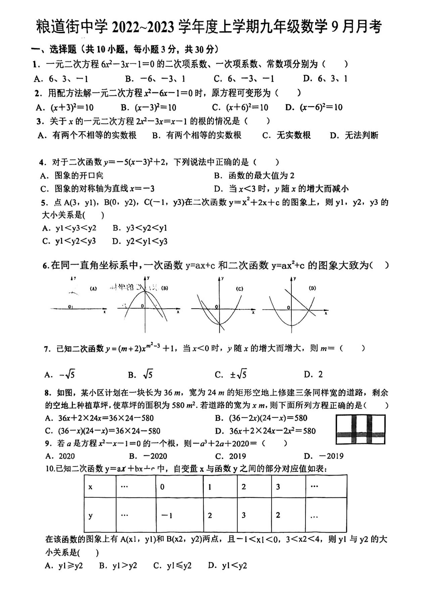 武汉市粮道街中学2022-2023学年上学期9月考九年级数学试题(扫描版)