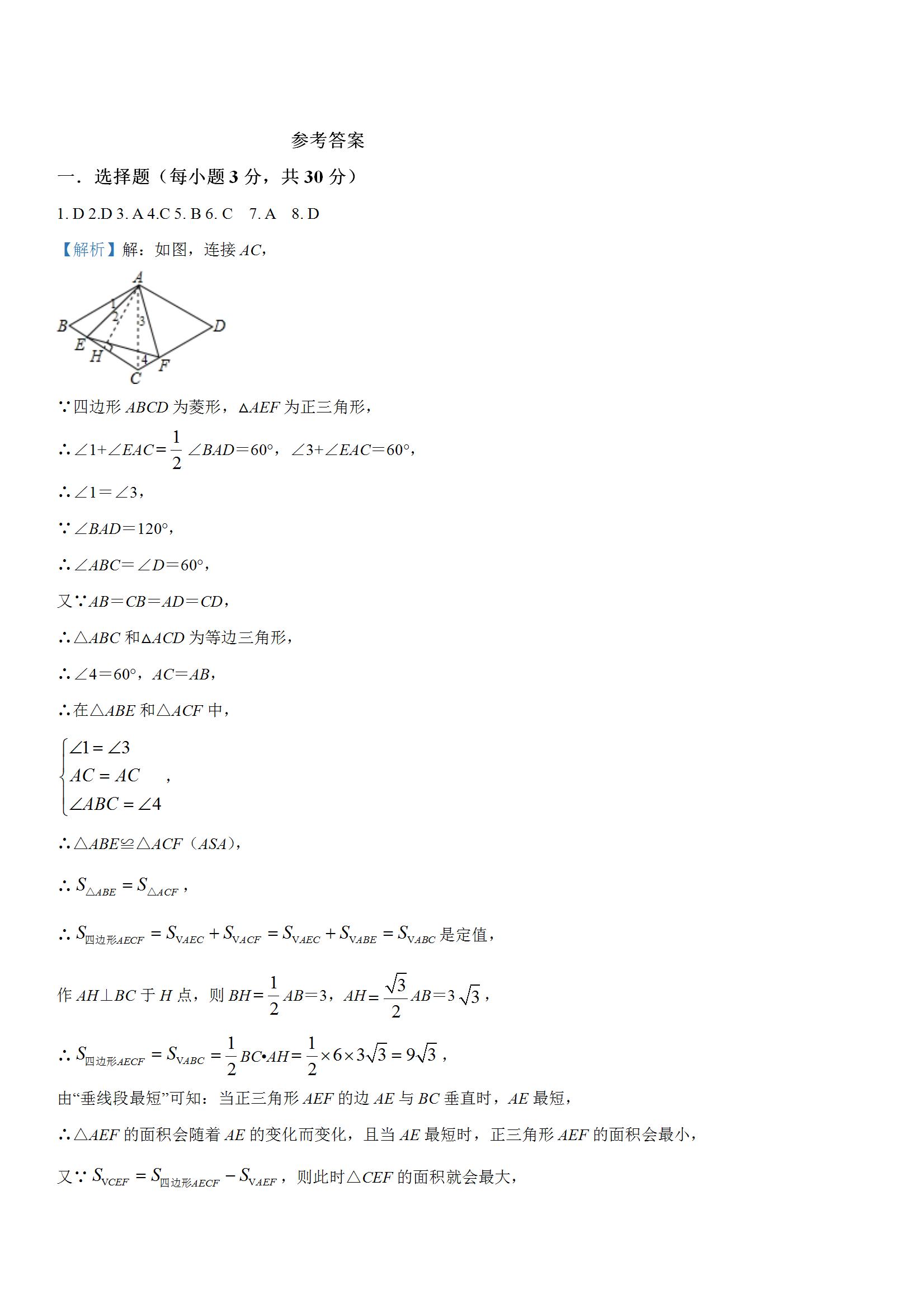 江夏区2022--2023学年度第一学期九年级9月学科小结数学参考答案