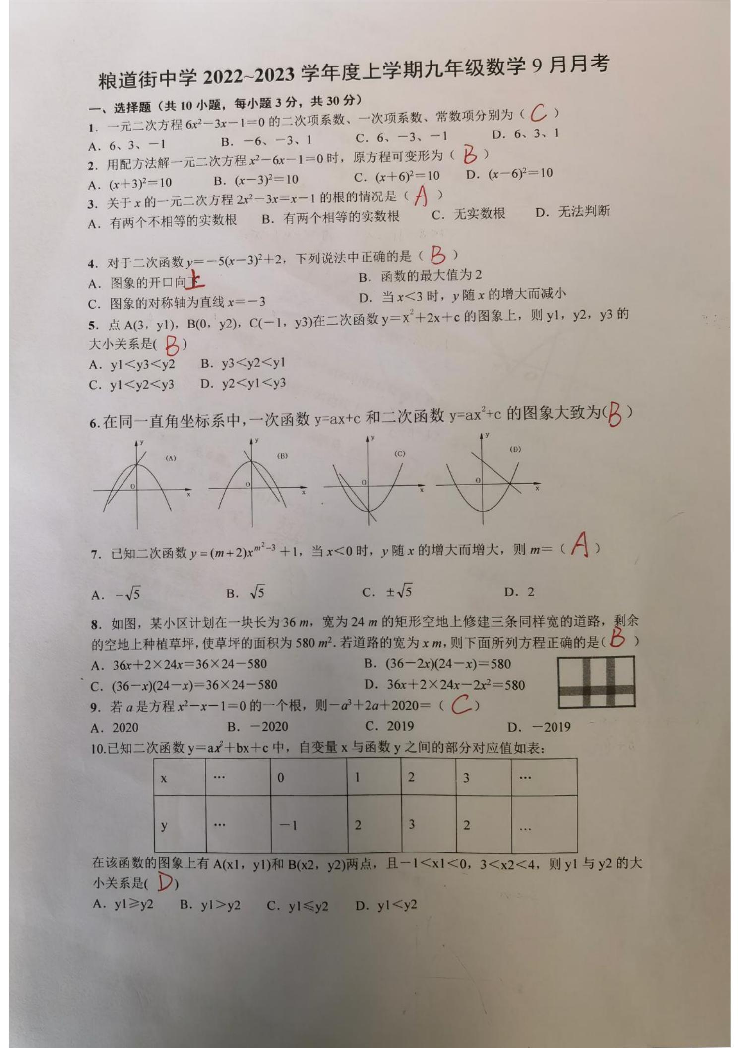 武汉市粮道街中学2022-2023学年上学期9月考九年级数学参考答案