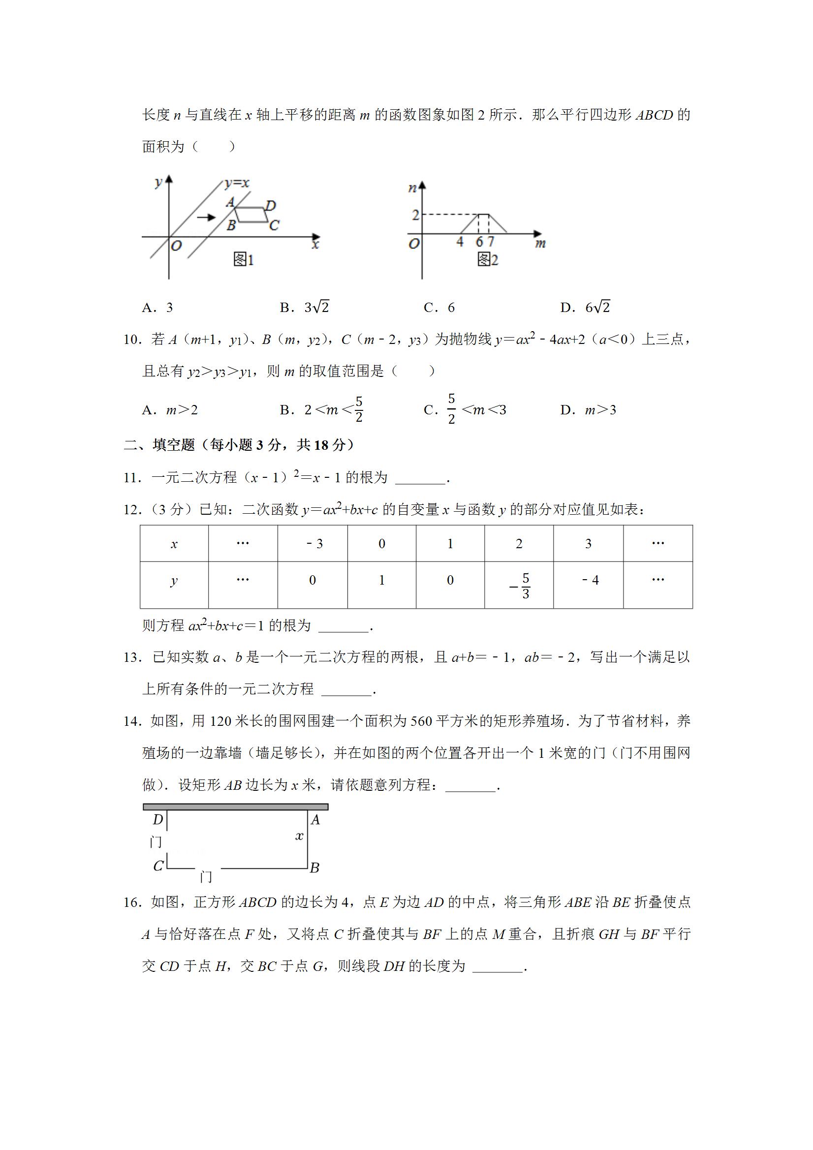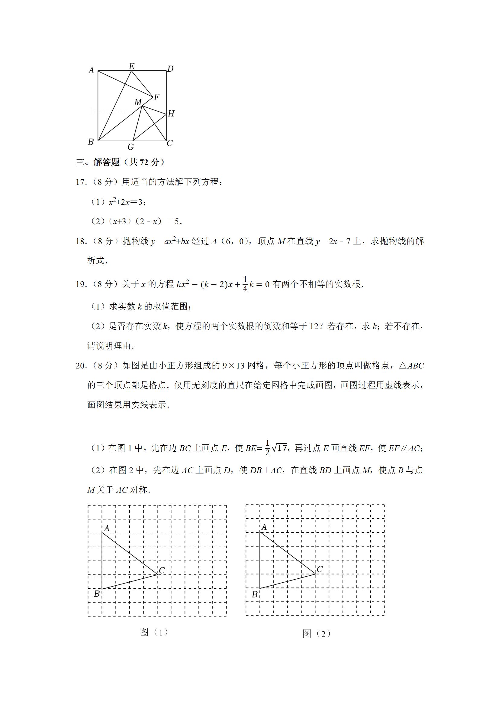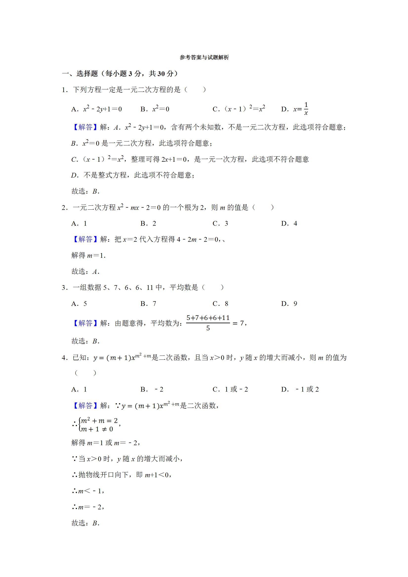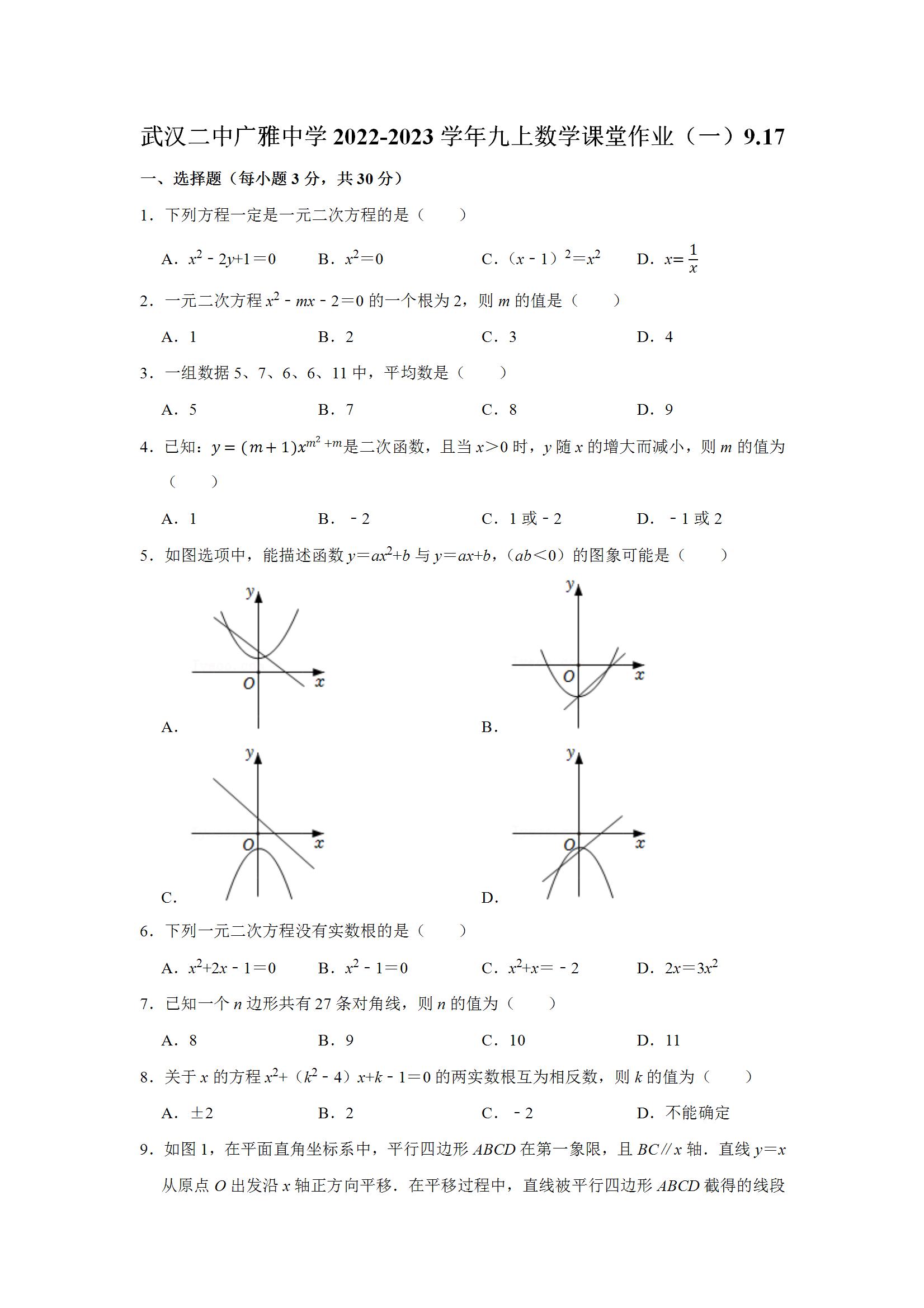 武汉二中广雅中学2022-2023学年上学期九年级数学课堂作业(一)9.17(word版含解析)