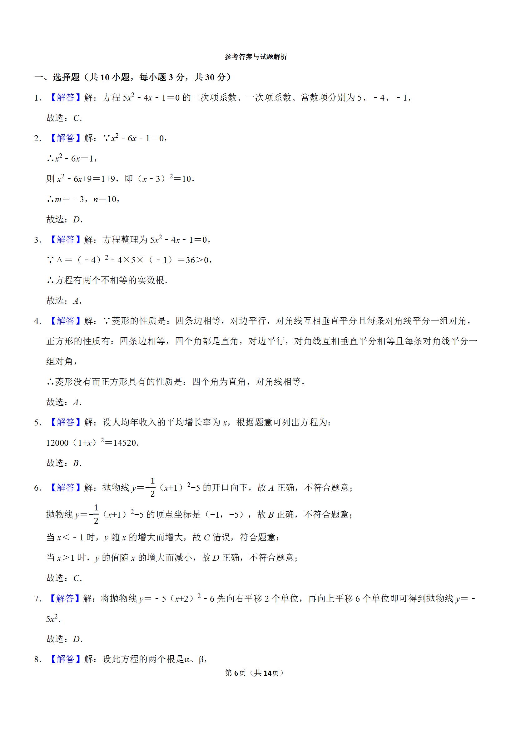 武汉二中广雅中学2022-2023学年上学期九年级数学课堂作业(一)9.17(word版含解析)