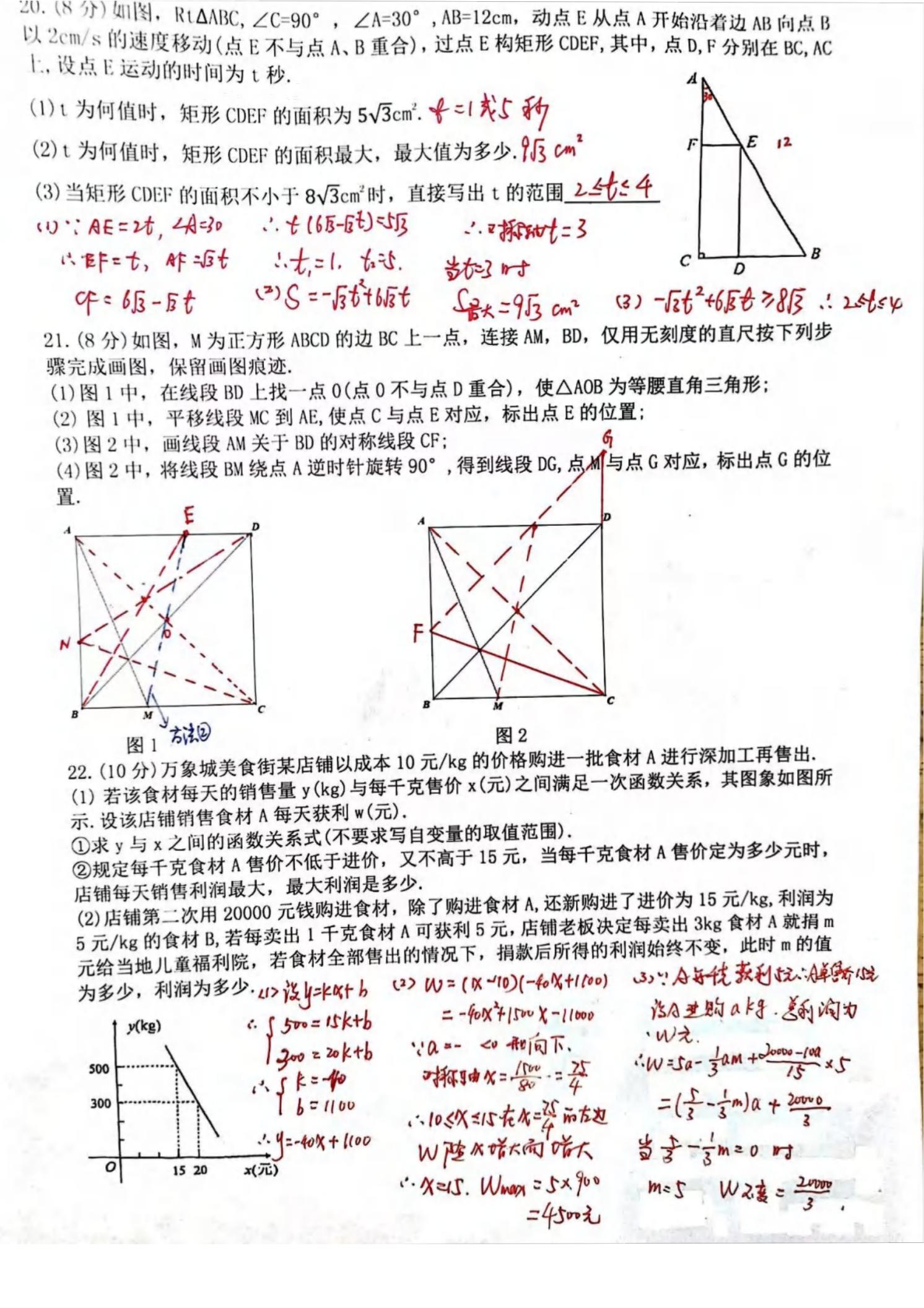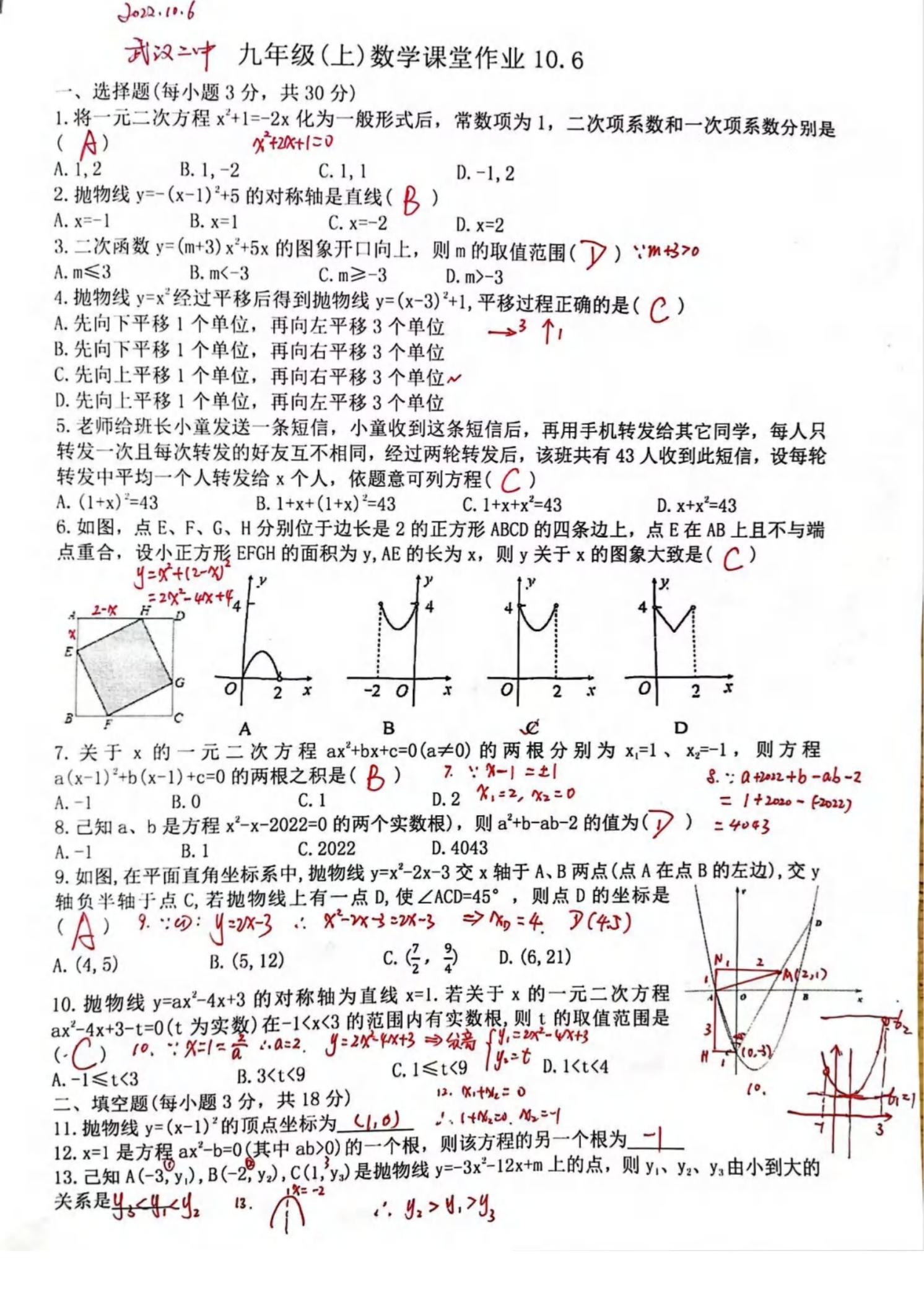 武汉二中广雅中学2022-2023学年上学期九年级数学课堂作业(二)10.6