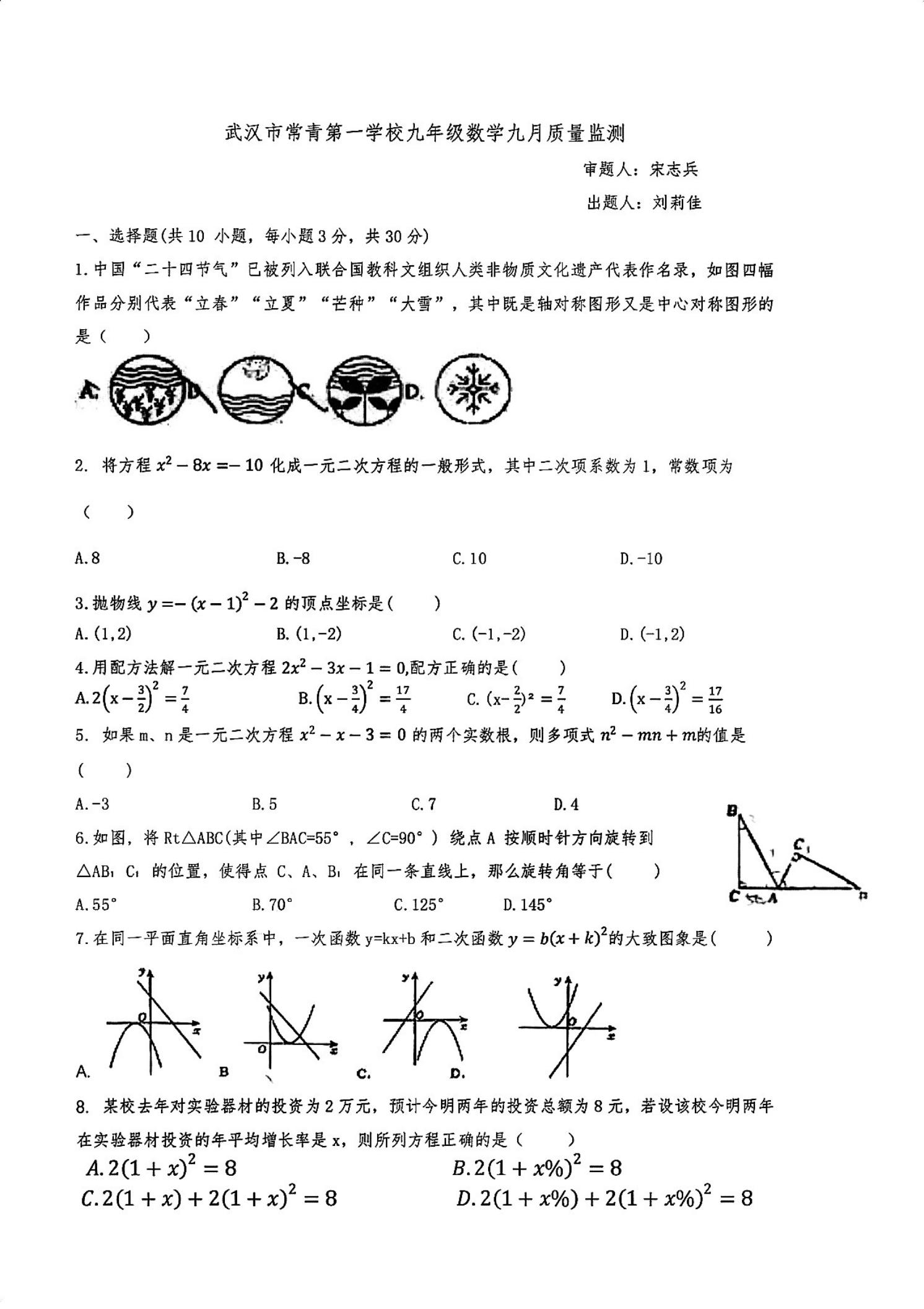 武汉市常青第一学校2025-2026学年9月九年级数学试题(PDF版)
