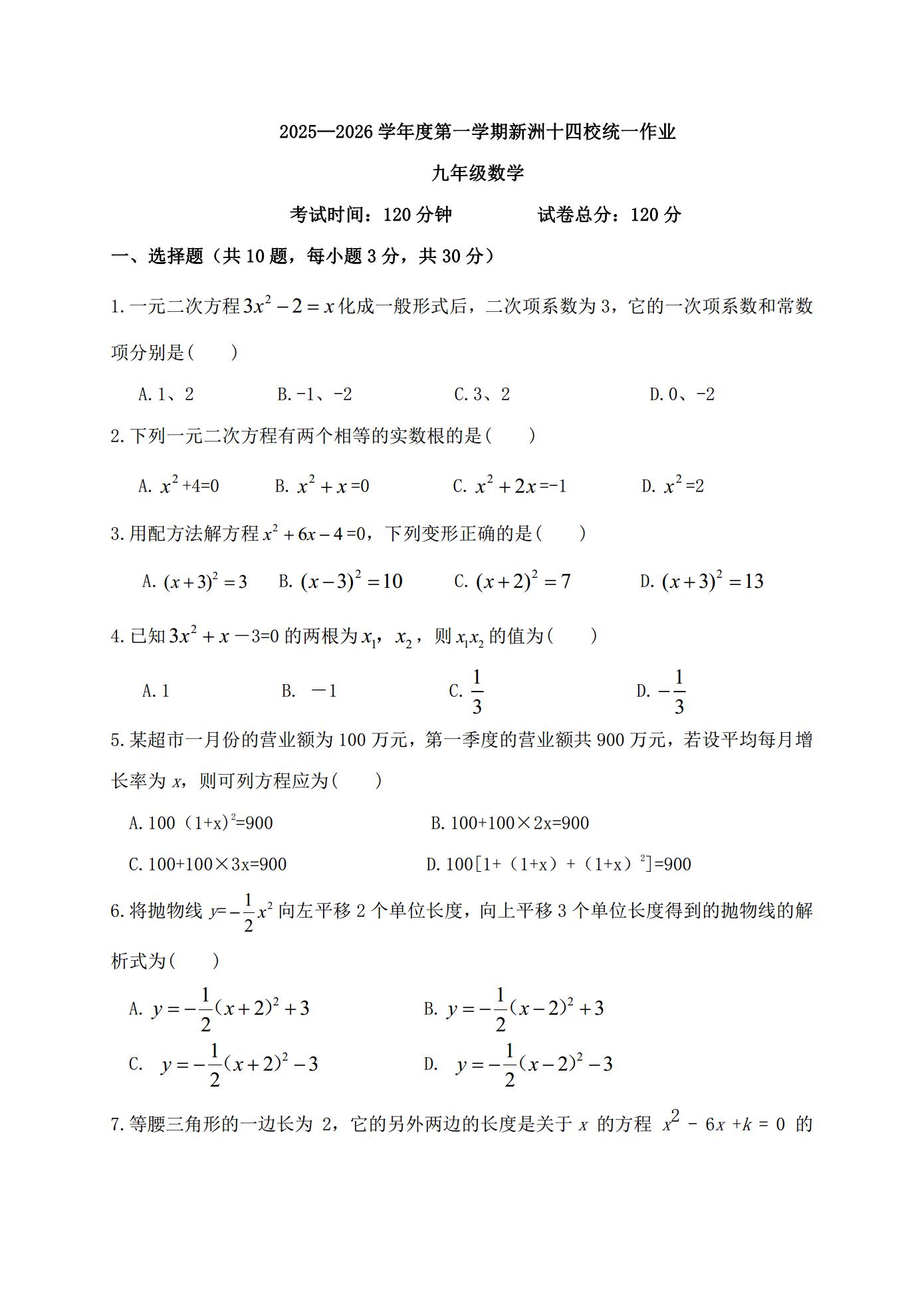 新洲区2025-2026学年上学期10月九年级数学试题(PDF版)