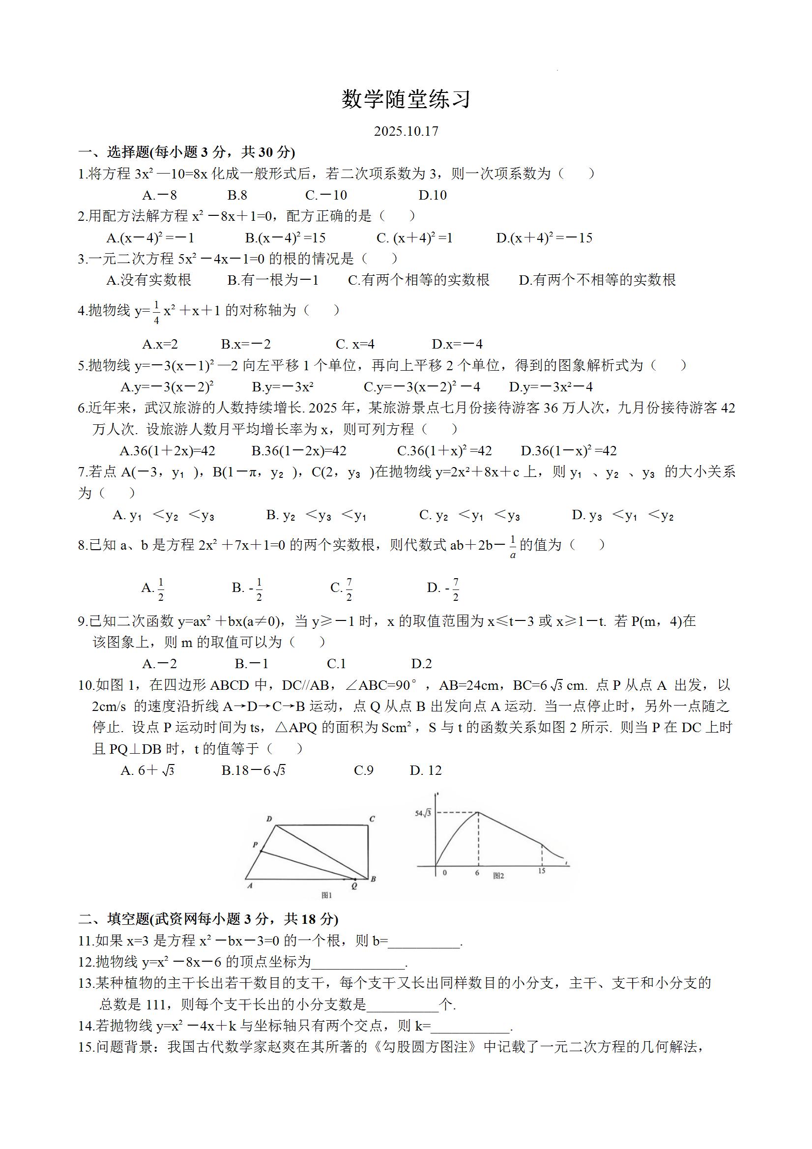 武昌区部分学校2025-2026学年上学期10月九年级数学试题(word版含标答)