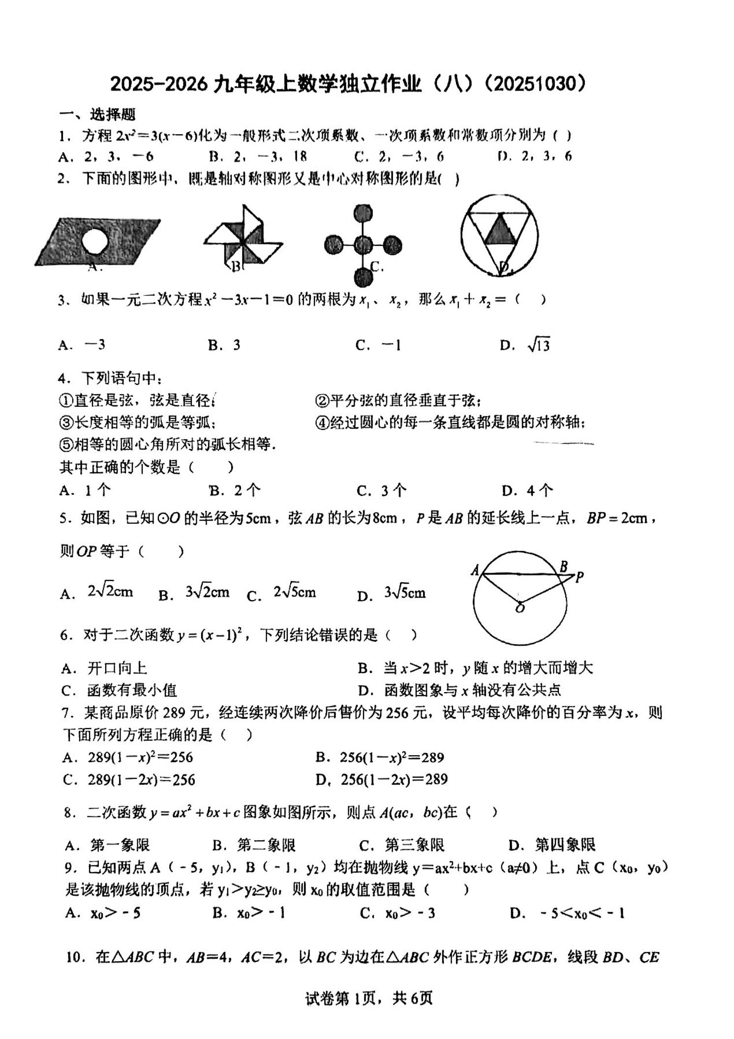 七一中学2025-2026学年九上数学第8周独立作业10.30(PDF版含答案)