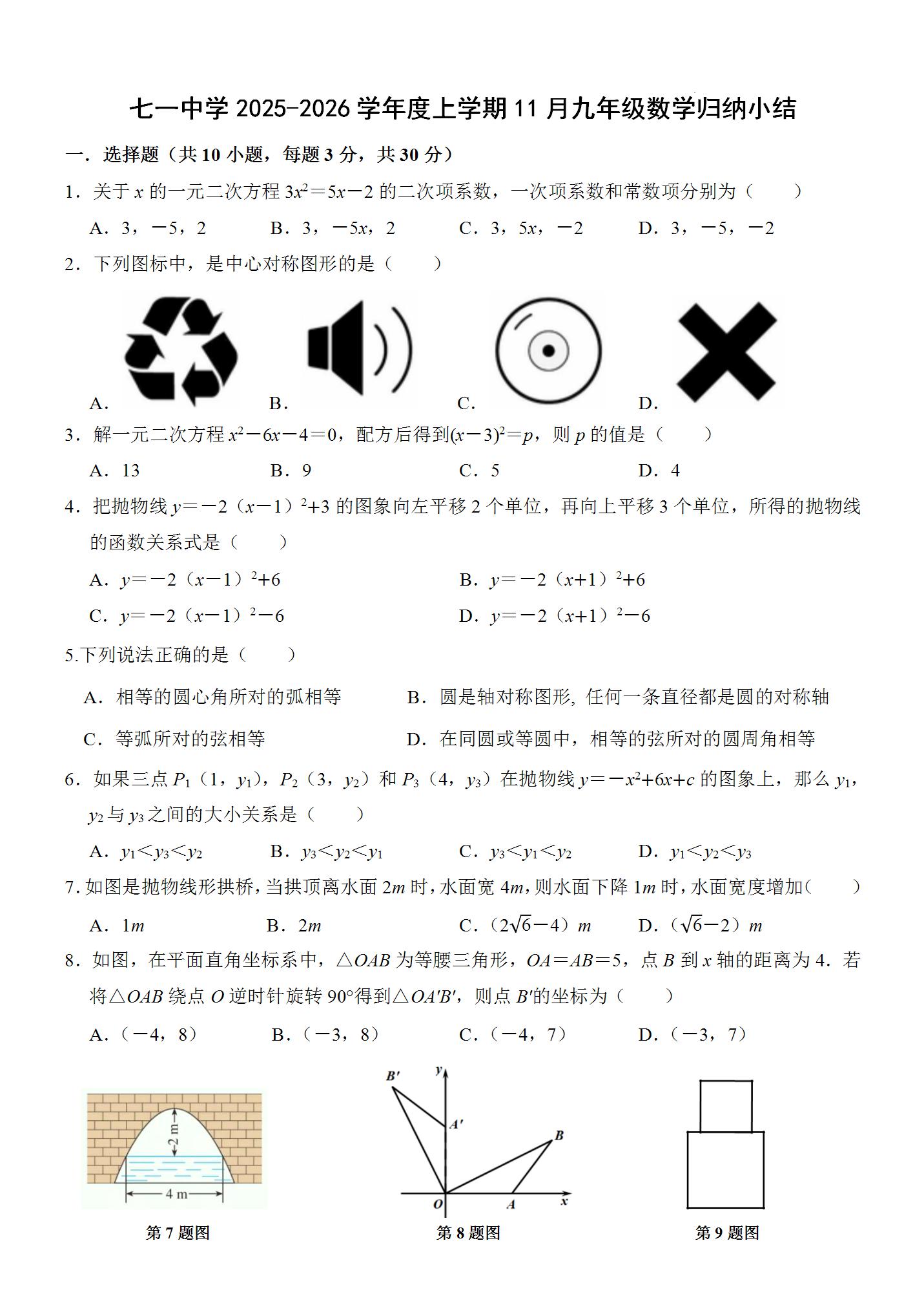 七一中学2025-2026学年度上学期11月九年级数学归纳小结 (word版)