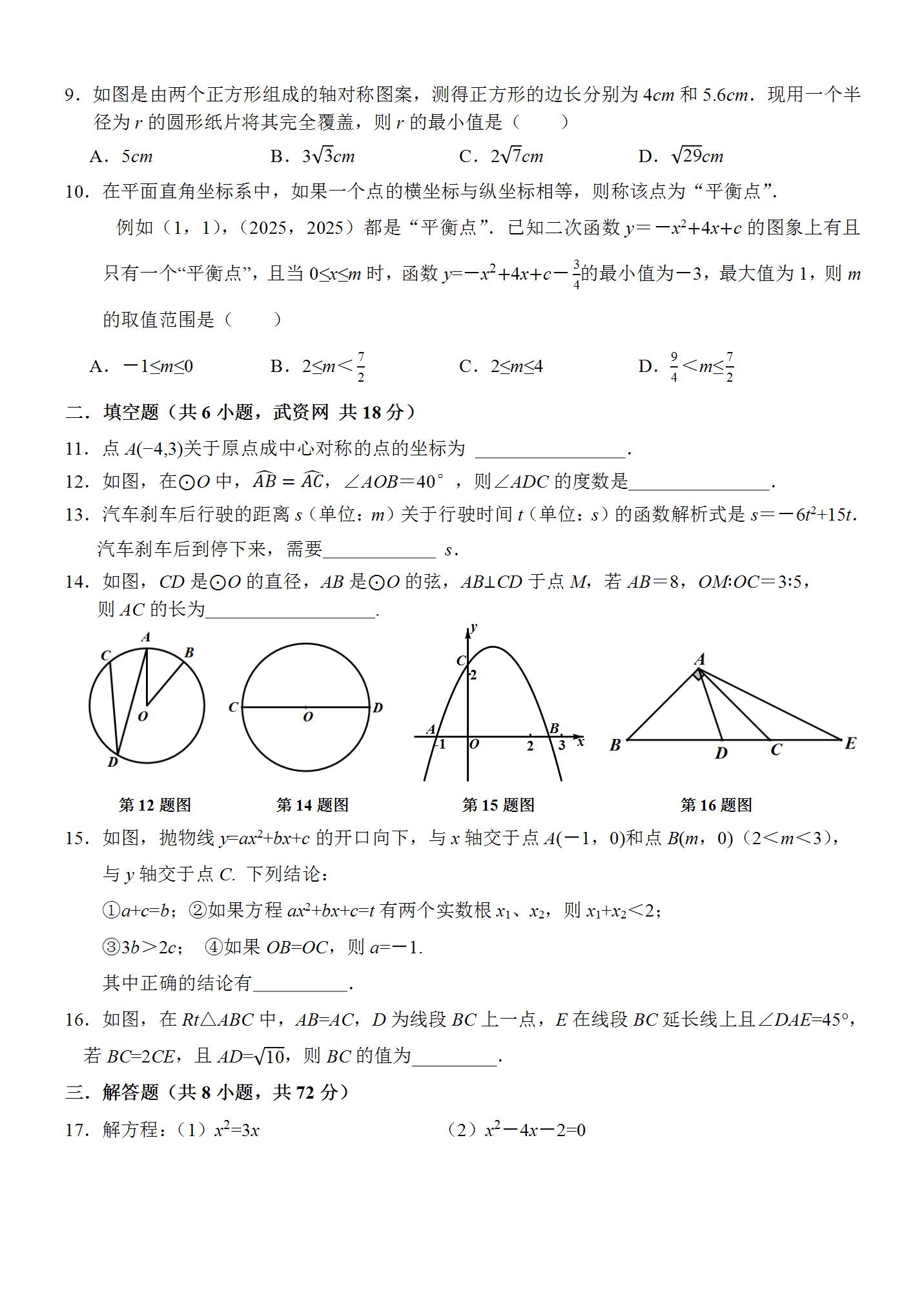 蔡甸区幸福路中学2025-2026学年上学期10月九年级数学试题(word版含答案)