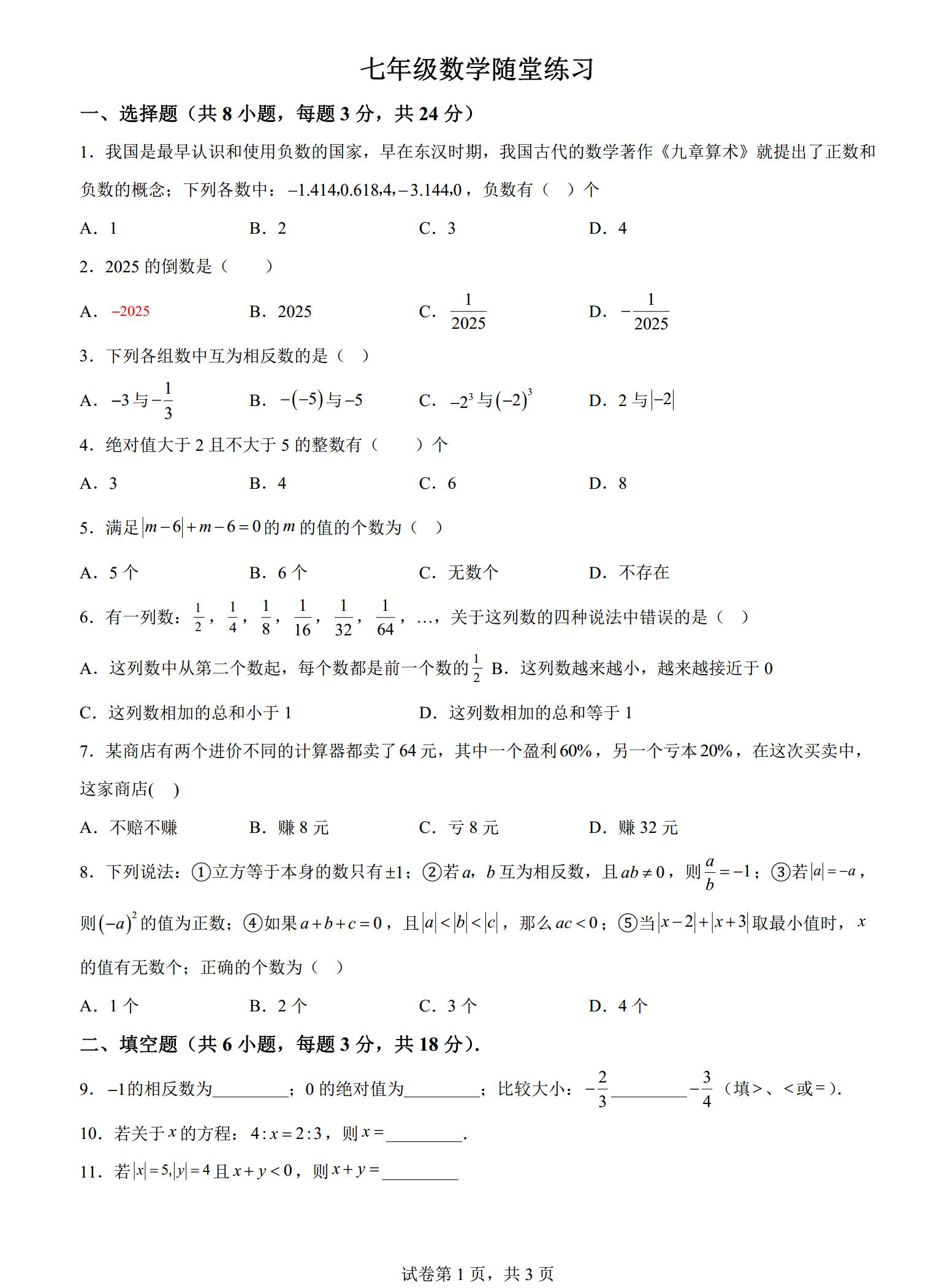 武汉二中广雅中学2025-2026学年七上数学随堂作业(一)(高清PDF版含解析)