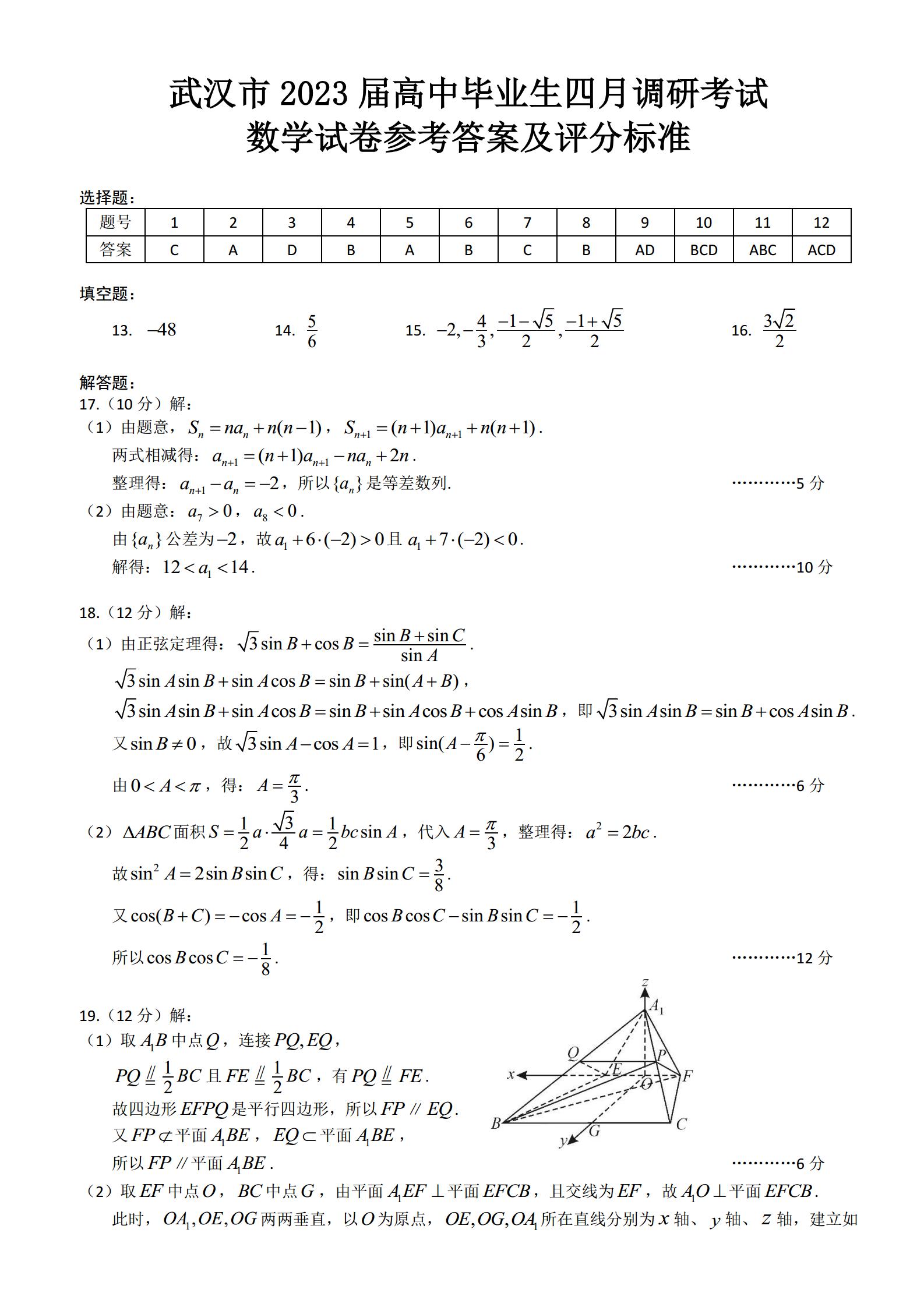 武汉市2023届高中毕业生四月调考数学参考答案及评分标准