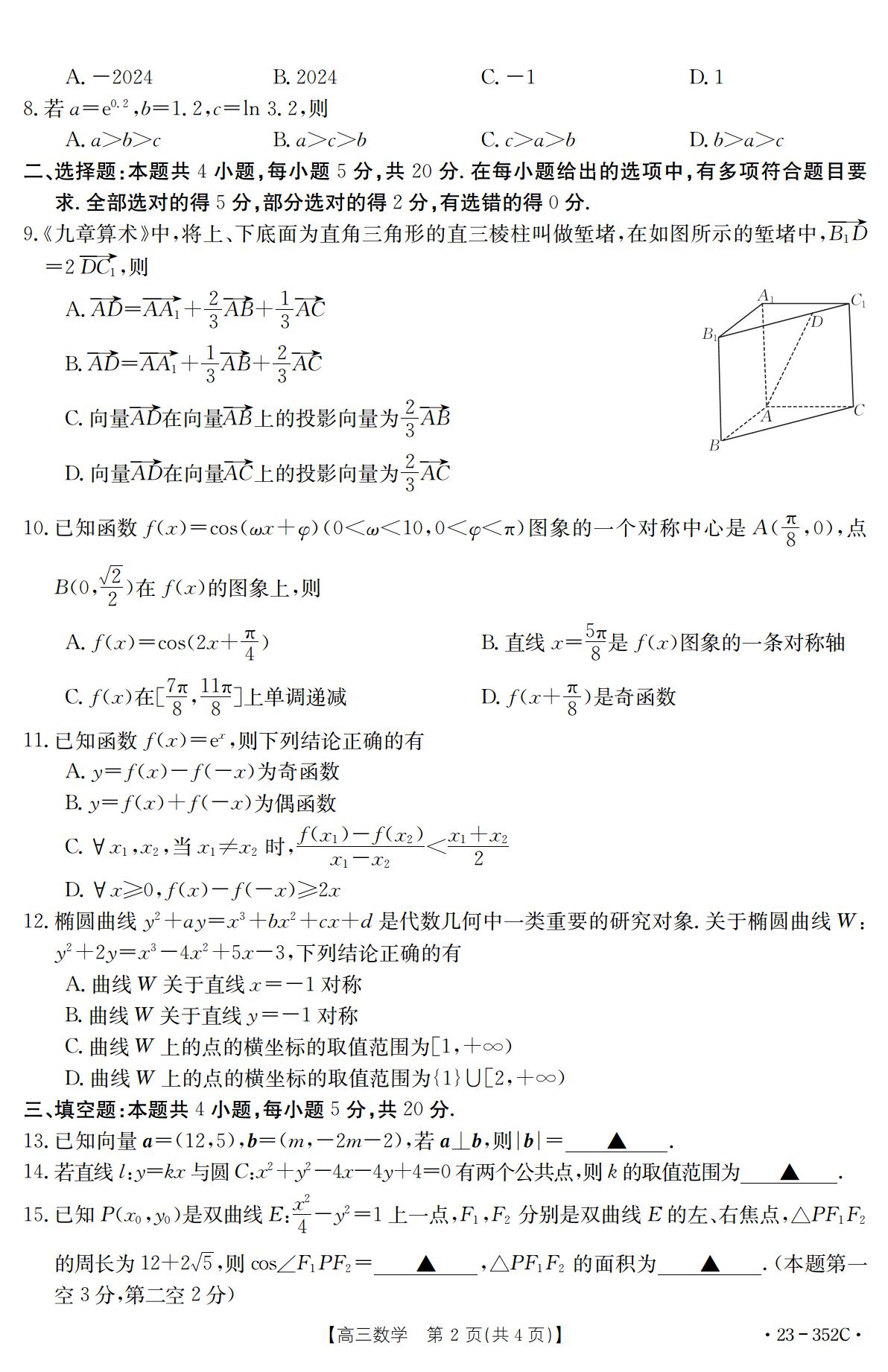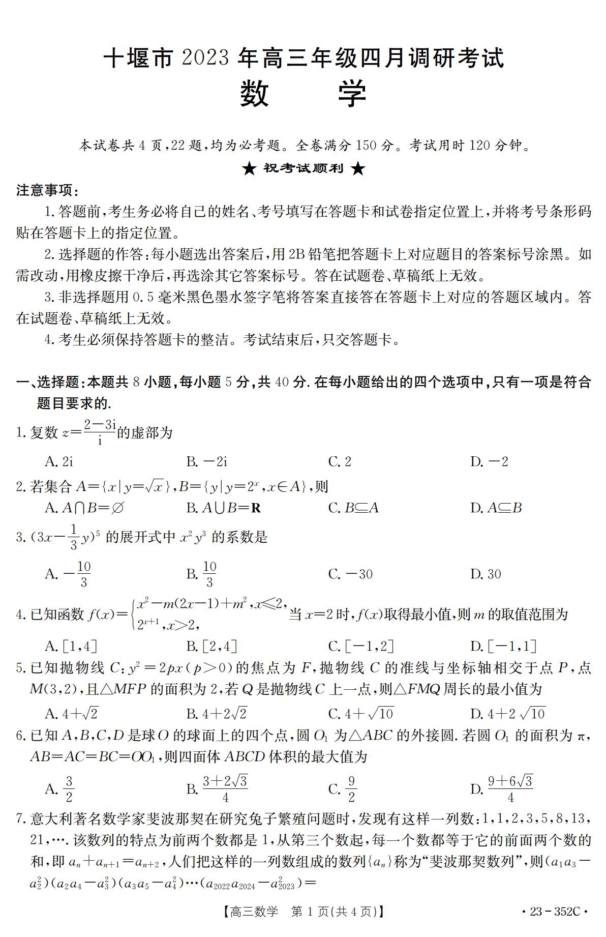 湖北省十堰市2022-2023学年高三下学期4月调研考试数学试题(word版含答案)