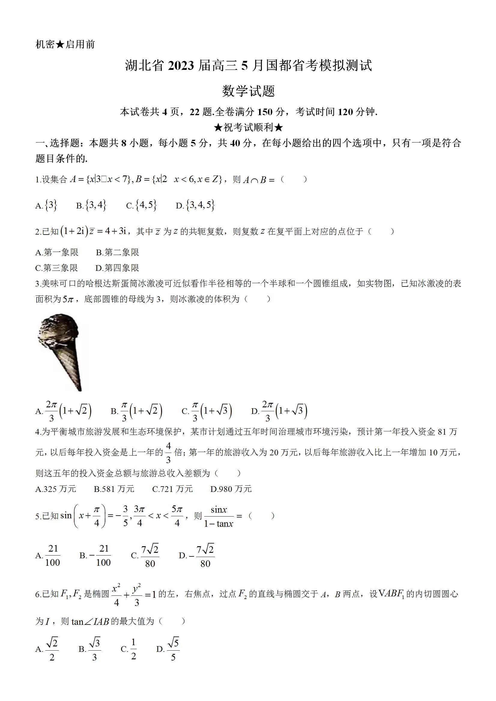湖北省国都省考2023届高三下学期5月模拟测试数学试题(word版含答案)