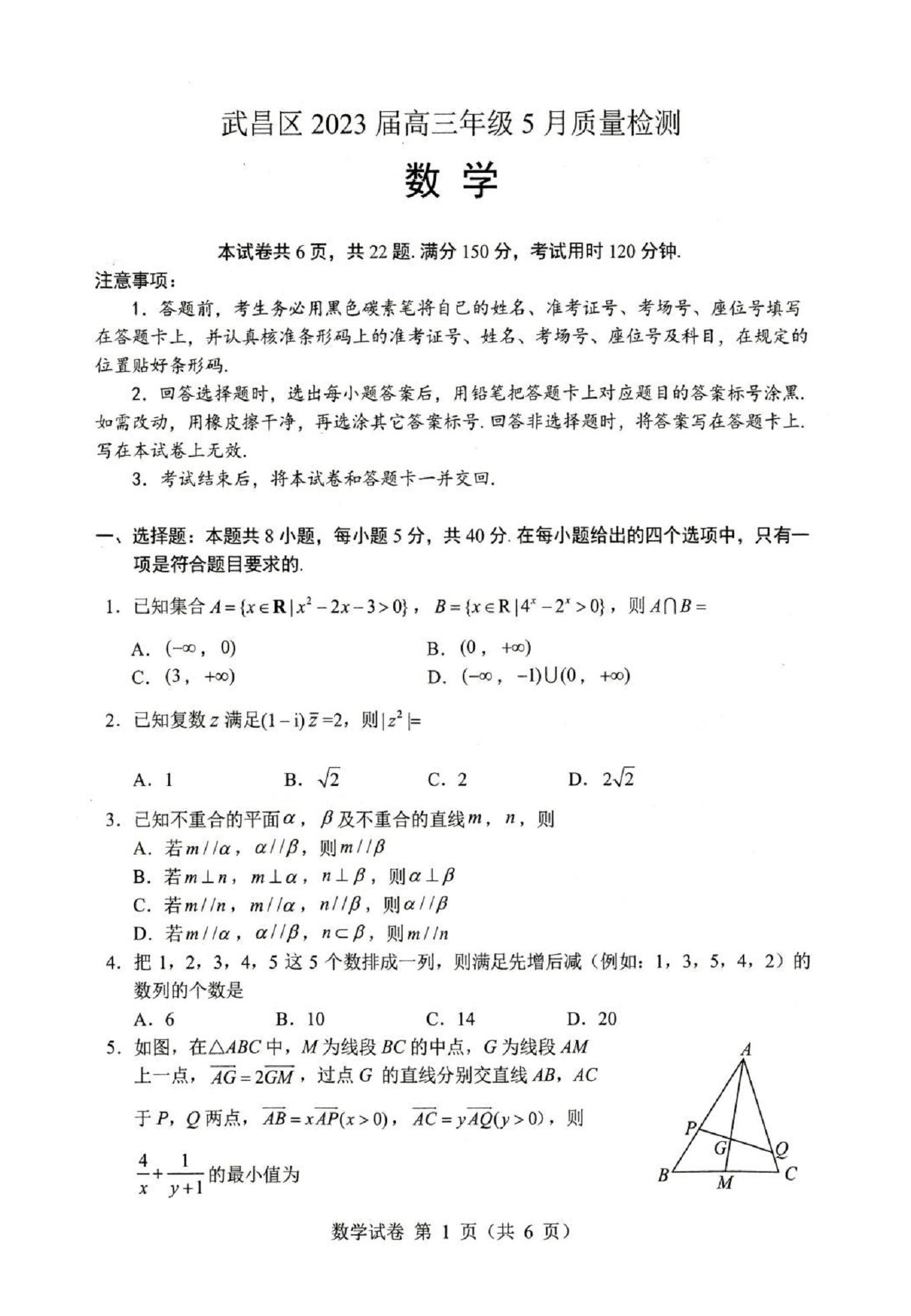 武汉市武昌区2023届高三下学期5月质量检测数学试题(word版含答案)