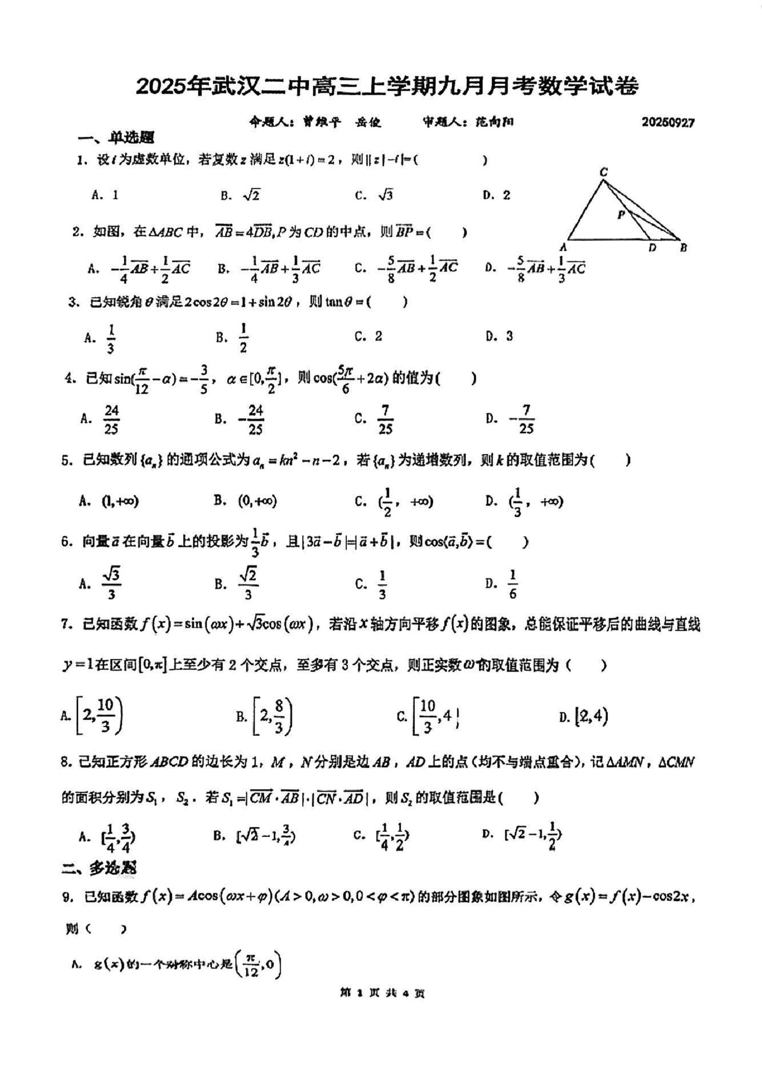 武汉二中2025-2026学年上学期高三上学期九月月考数学试卷(PDF版)