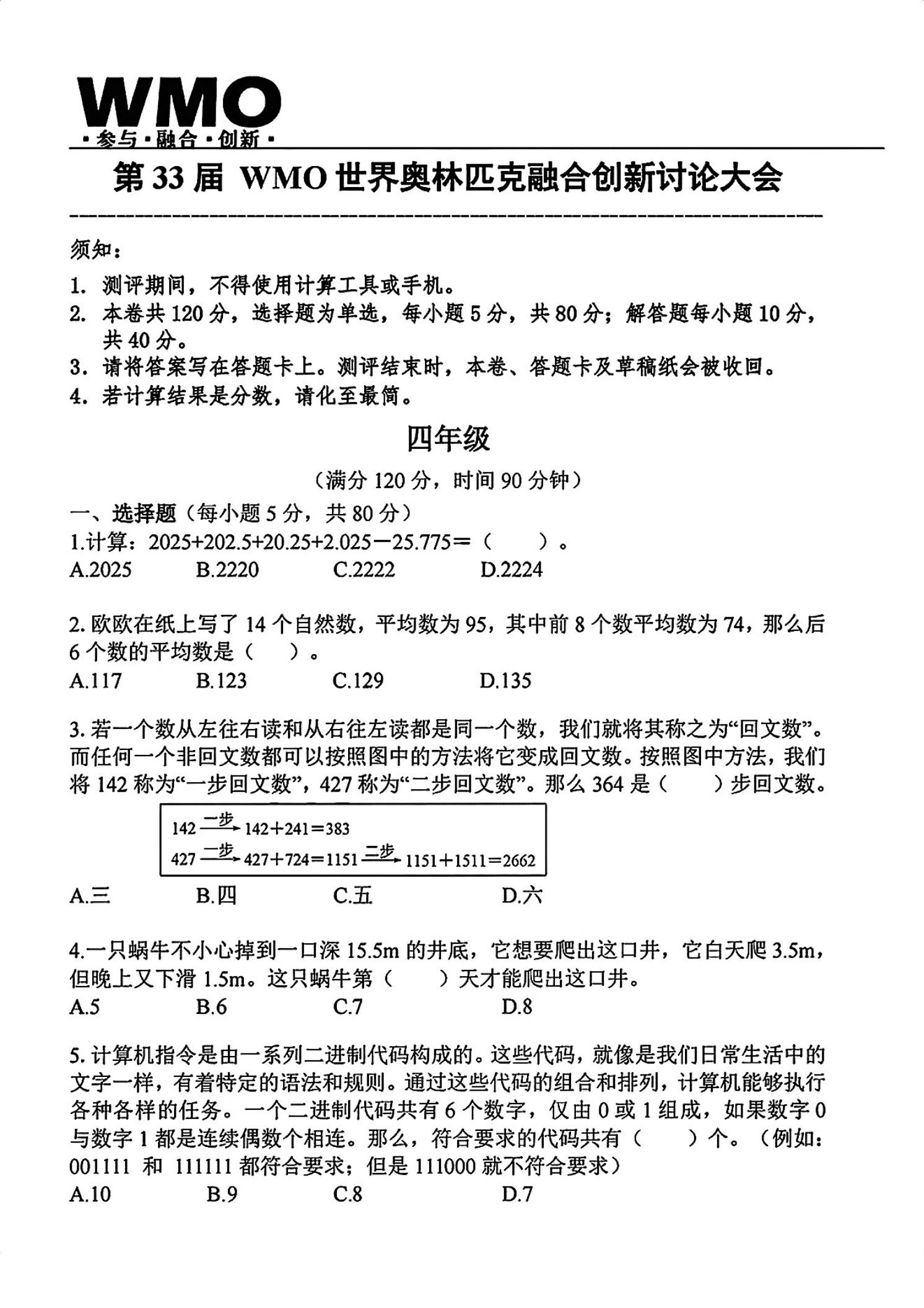 2025年第33届世奥赛四年级数学复赛试题(PDF版含答案)