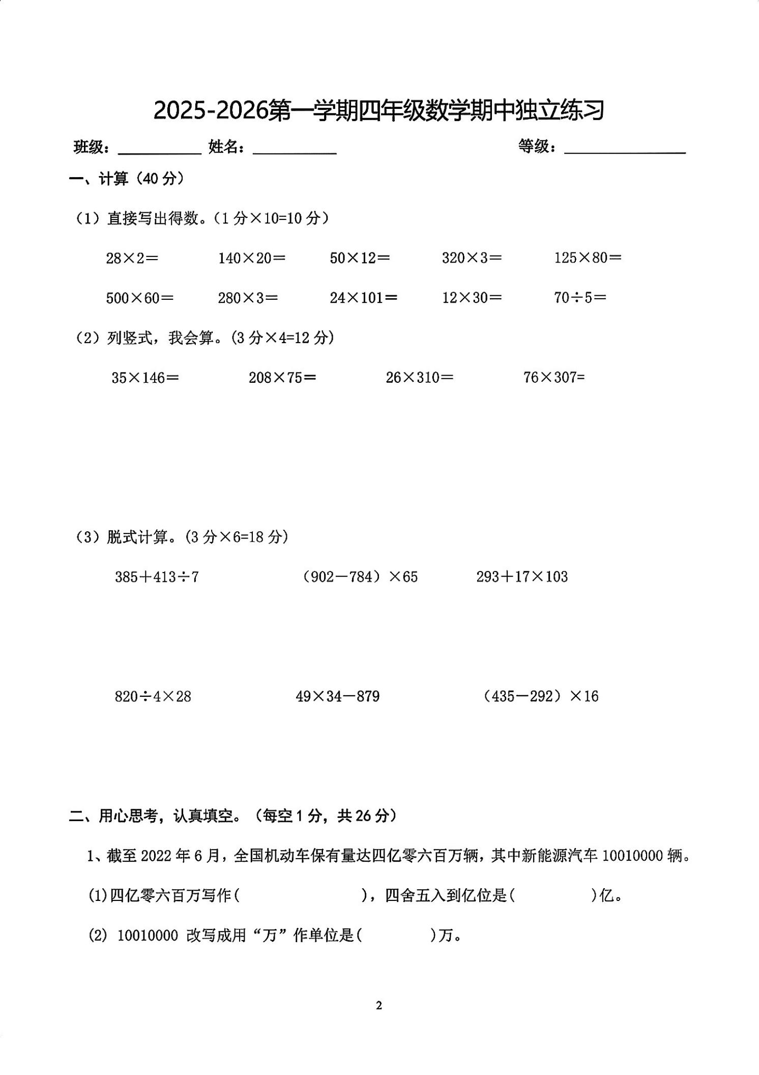 江岸区长春街小学2025-2026学年上学期期中四年级数学随堂练习(PDF版)