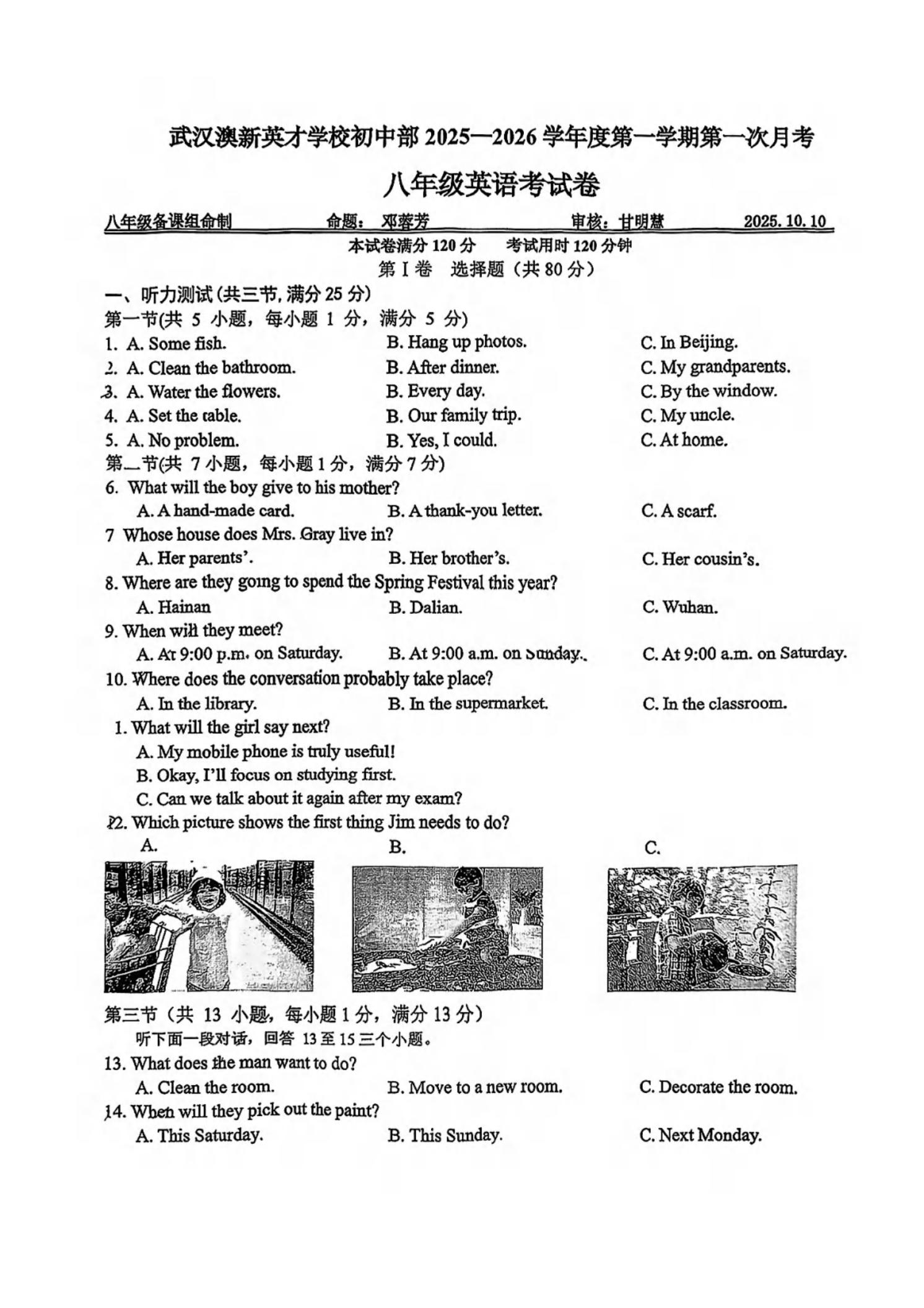 武汉澳新英才2025-2026学年10月八年级英语试题(PDF版)