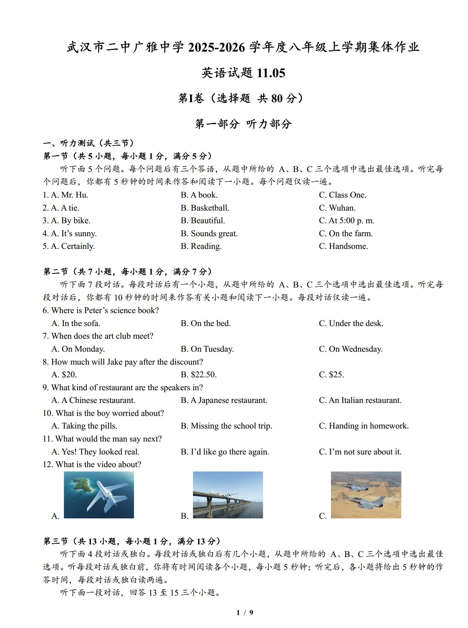 武汉二中广雅中学2025-2026学年八上英语集体作业11.5(PDF版含答案)