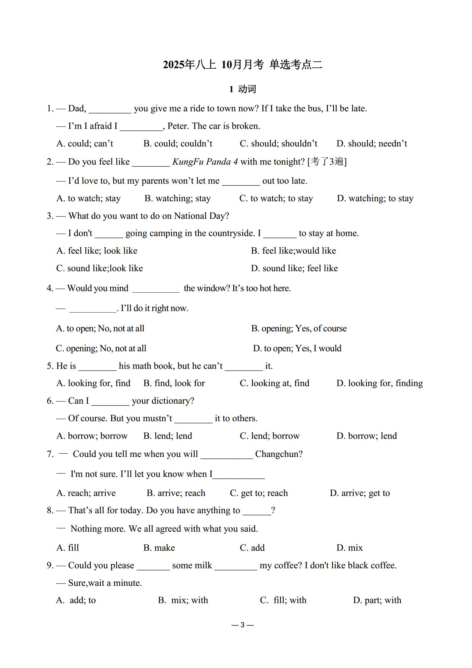 武汉市2025-2026学年年八上10月月考英语单选汇编(学生版)