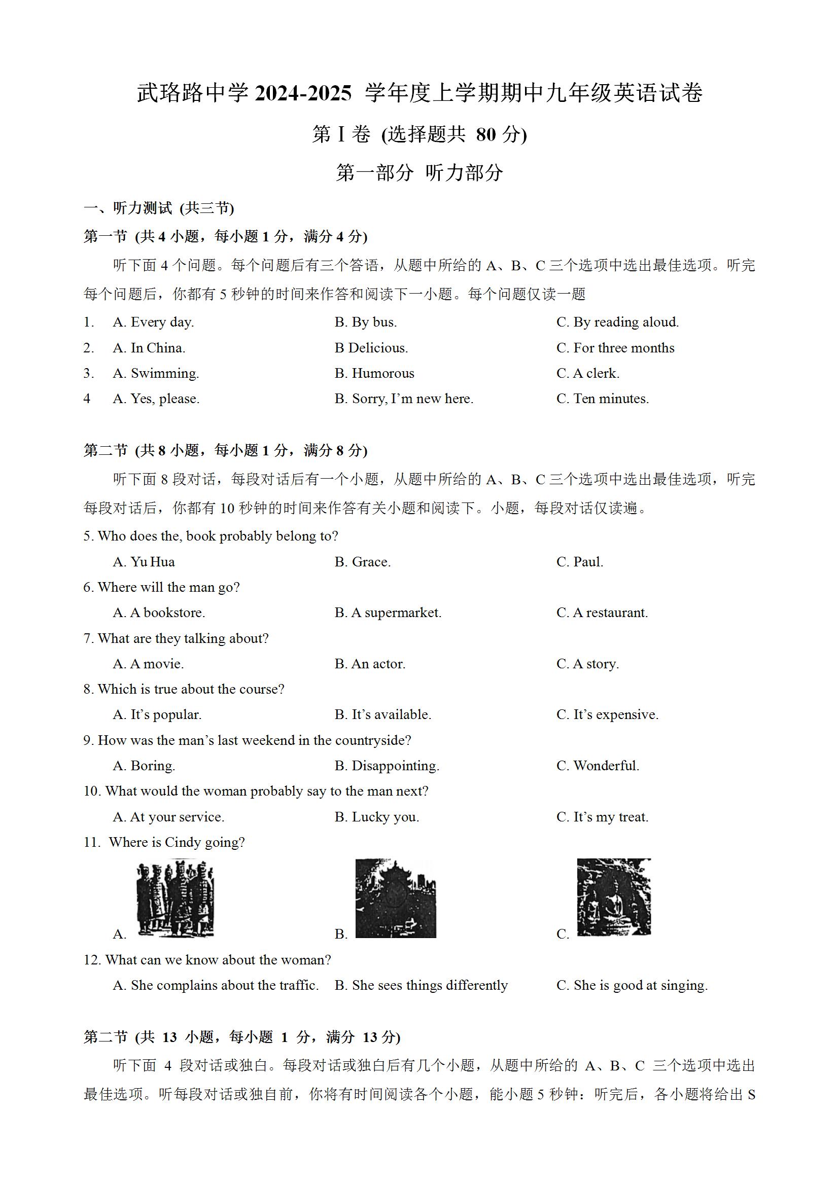武珞路中学2024-2025学年上学期期中九年级英语试题(word版含答案)