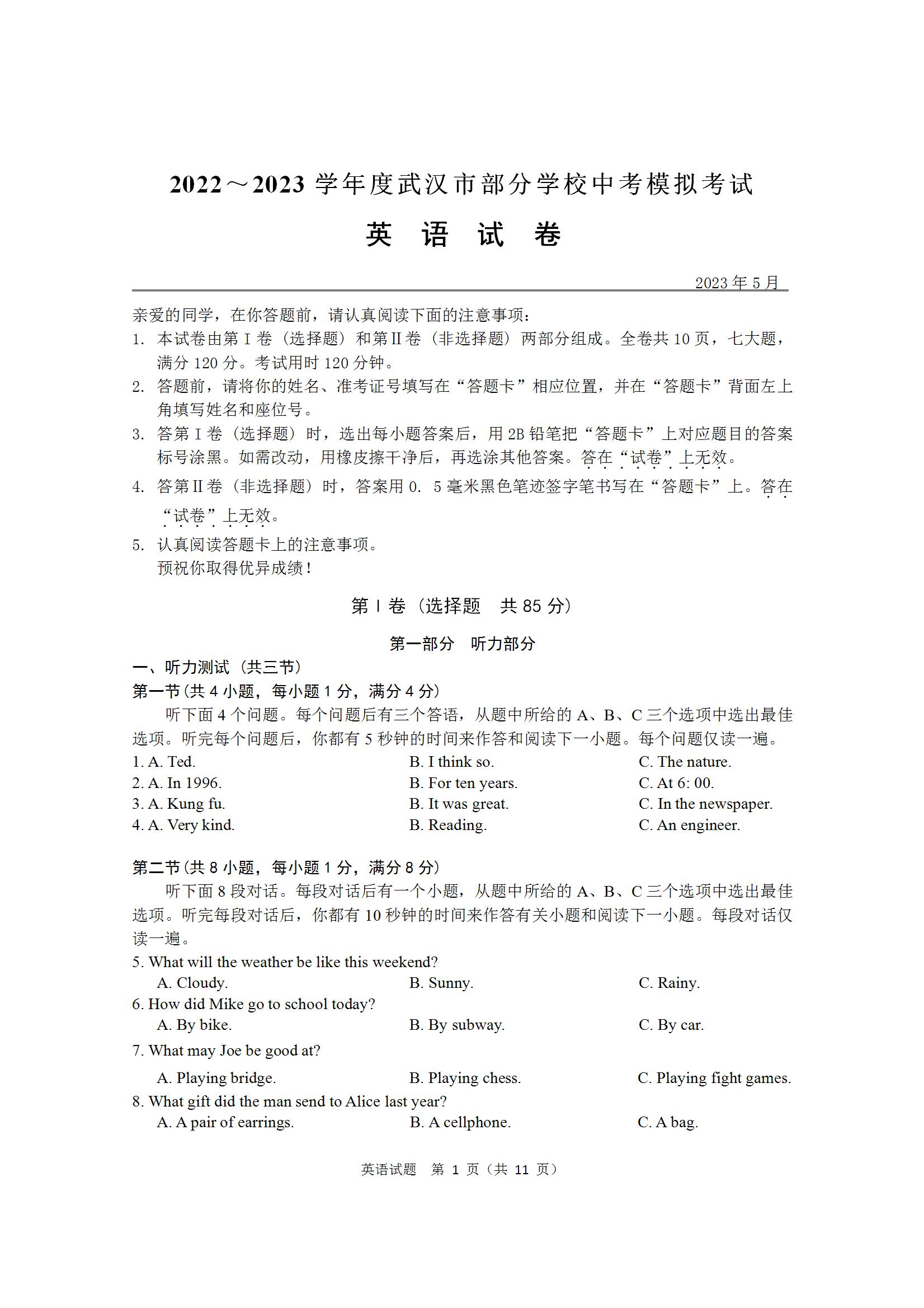 武汉市江夏、蔡甸区2022-2023学年五月九年级英语试卷(word版)
