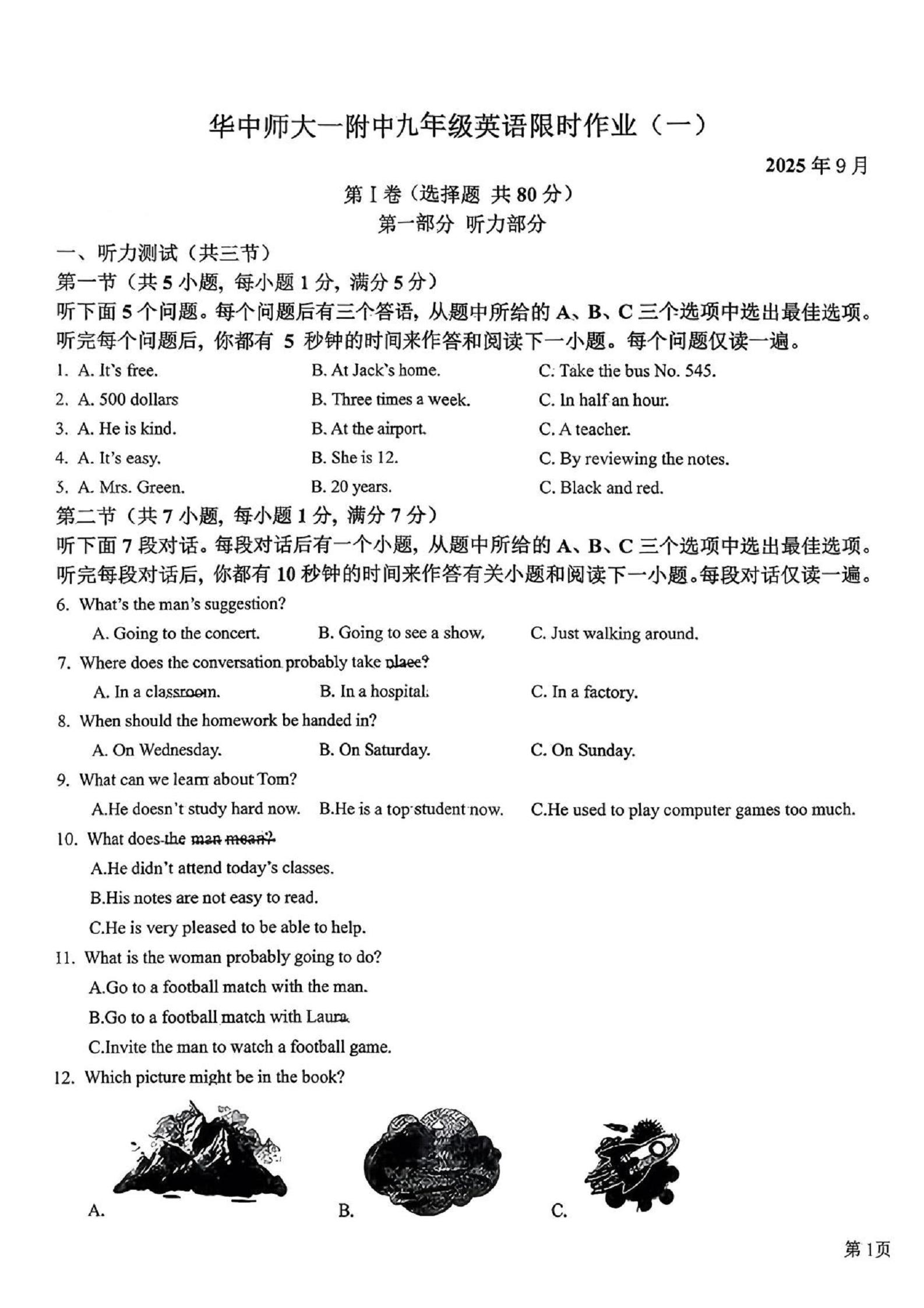【免费】华师一初中2025-2026学年上学期9月九年级英语试卷(PDF版)