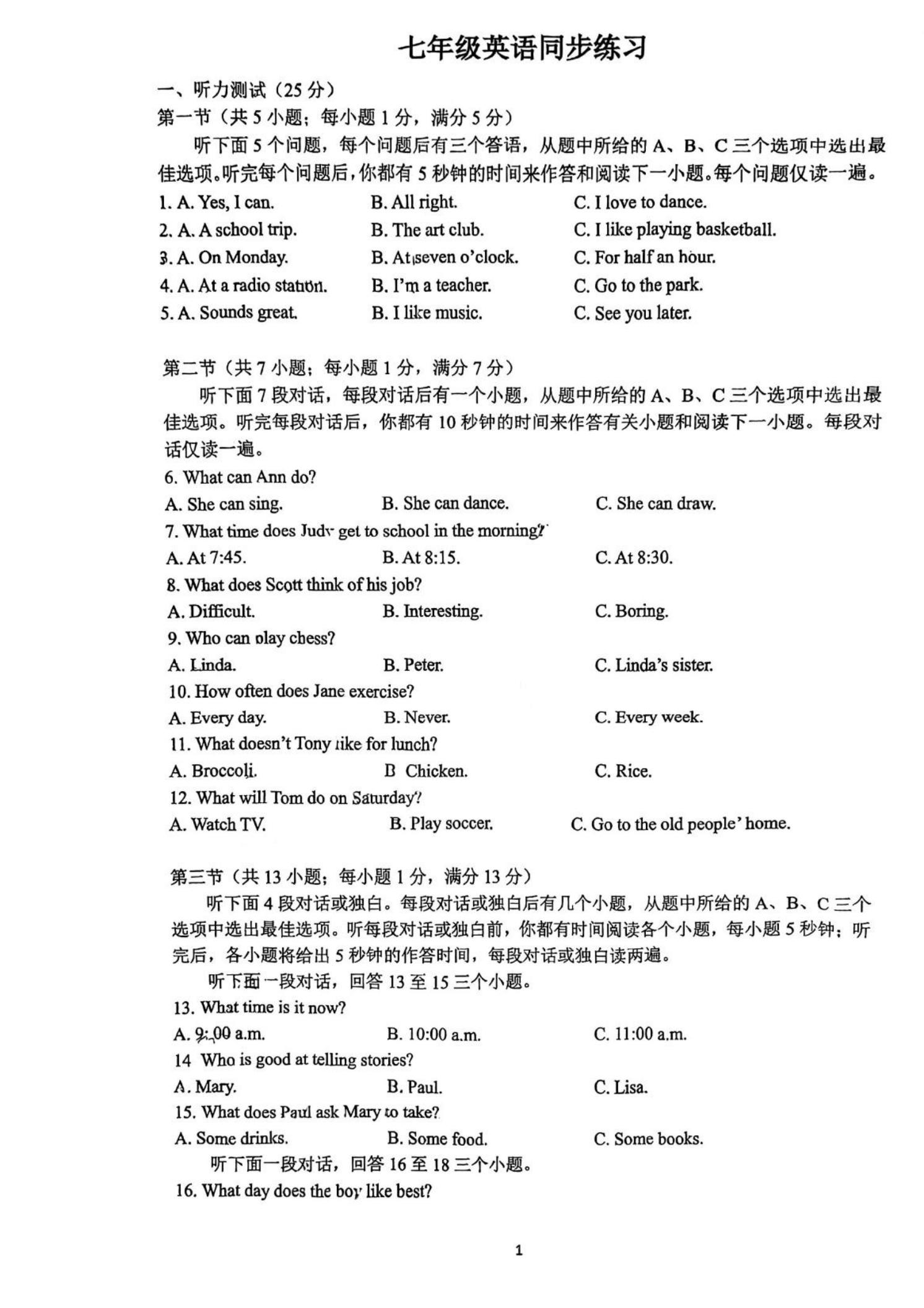 武汉一初慧泉2022-2023学年度下学期3月七年级英语同步练习参考答案及听力稿