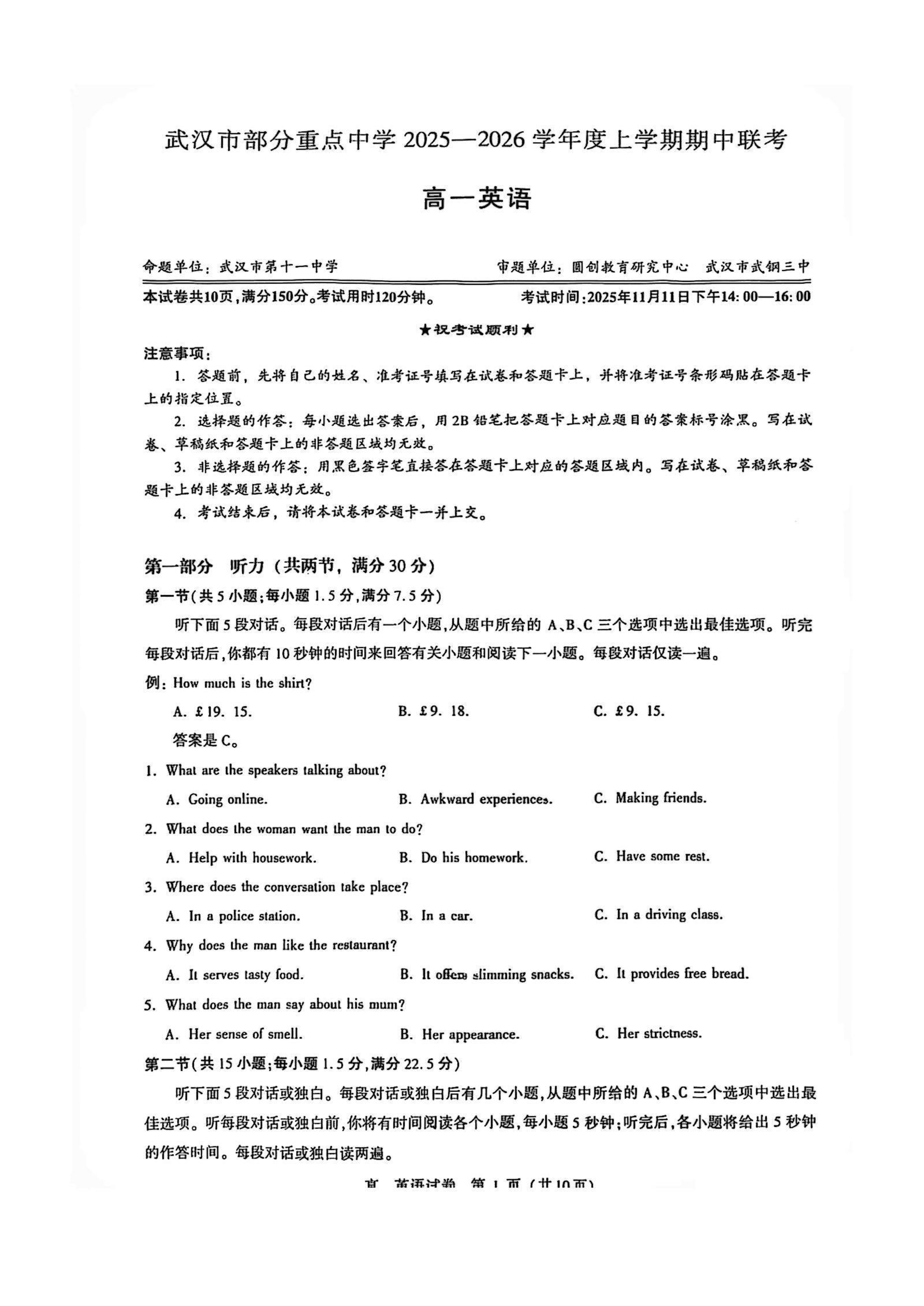 武汉中学2025-2026学年度高一上期中考试英语听力MP3