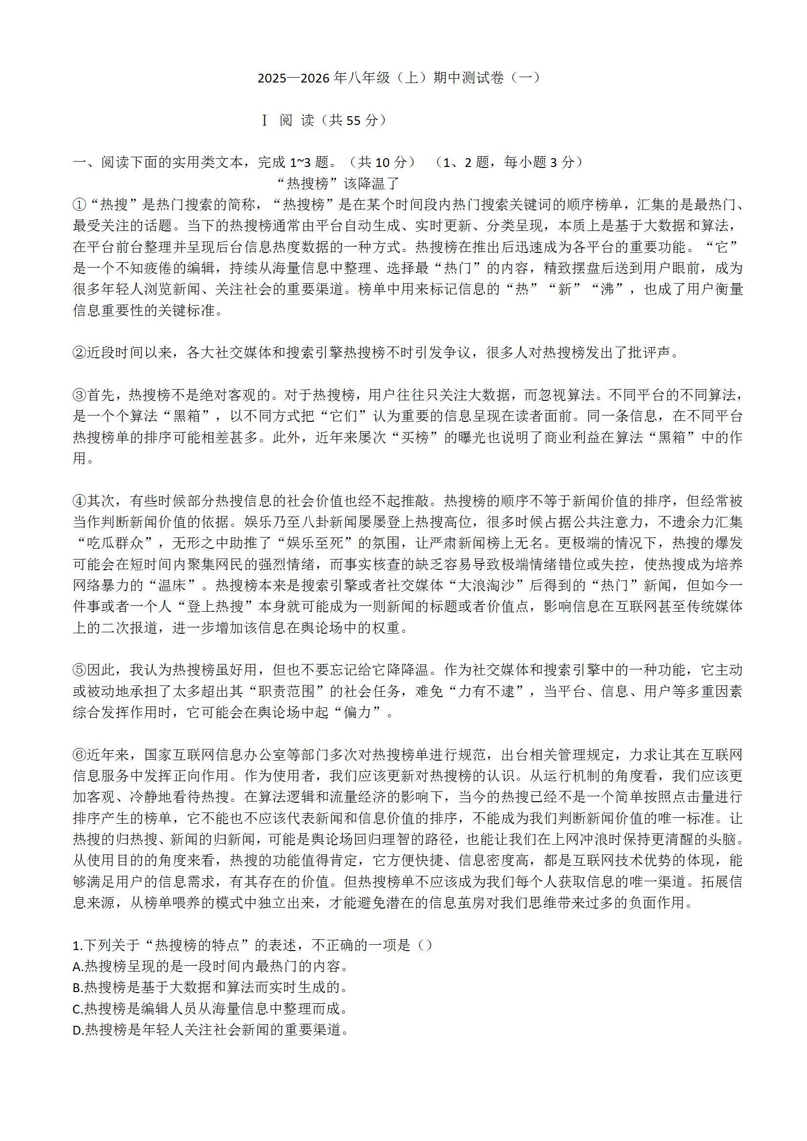 武汉轻松导练2025-2026学年八上期中模拟语文测试卷(一)(word版含答案)