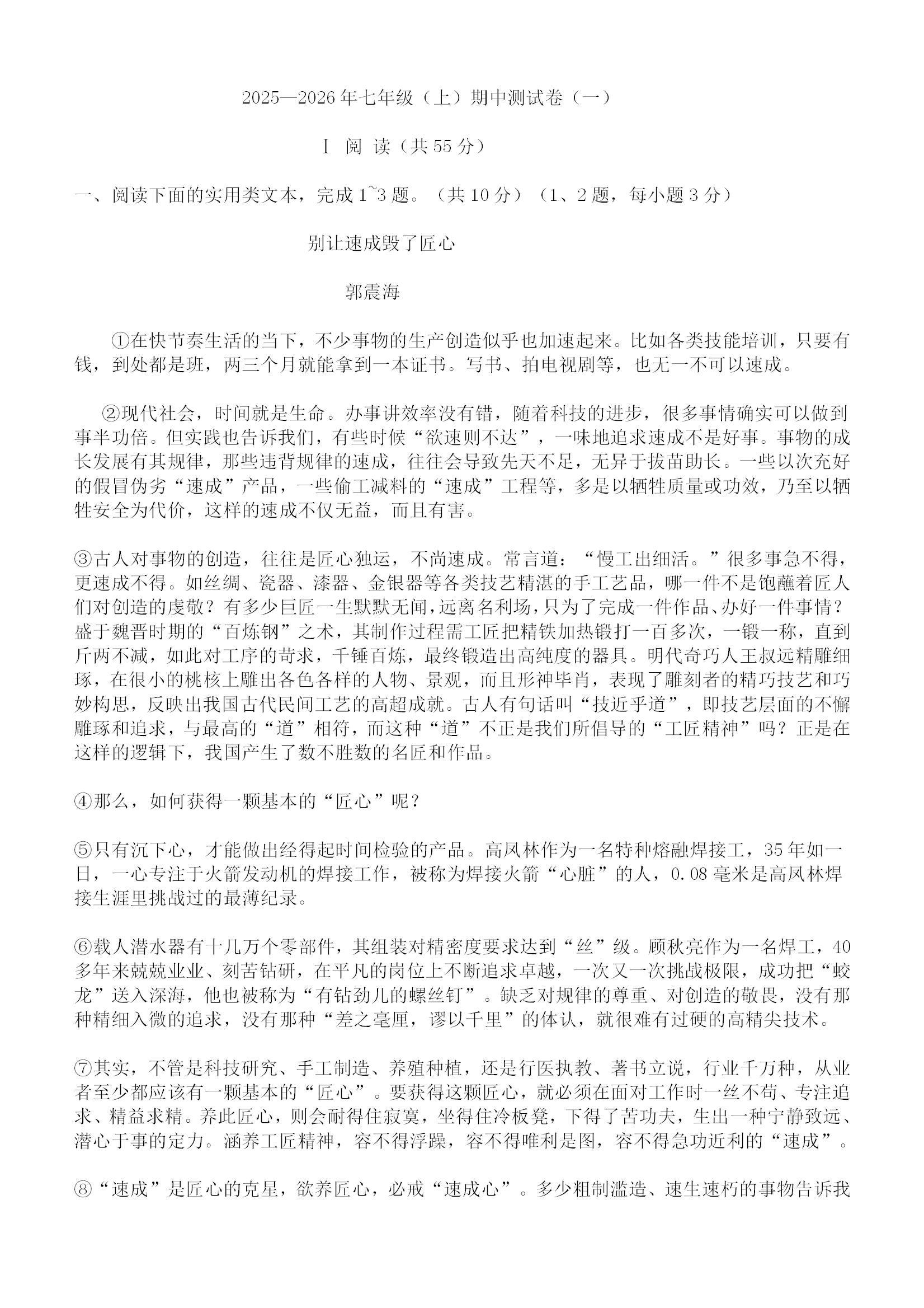 武汉轻松导练2025-2026学年七上期中模拟语文测试卷(一)(word版含答案)