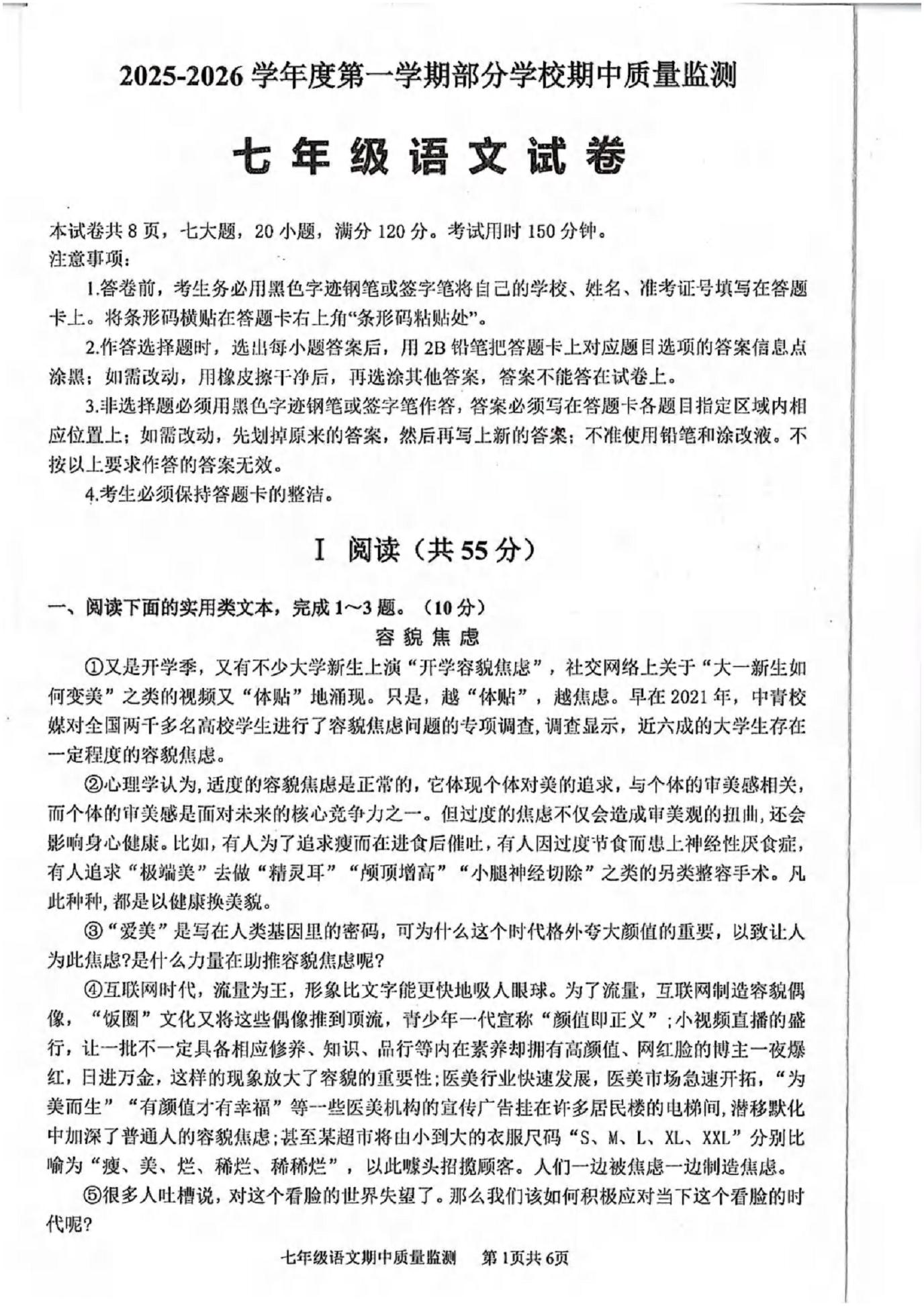 武汉市四区2025-2026学年上学期期中联考七年级语文试卷(PDF版)