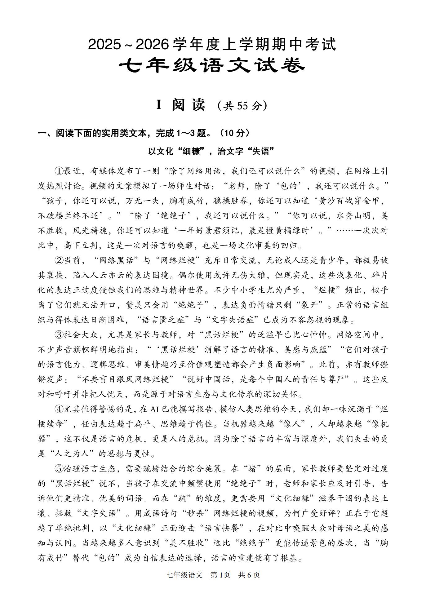 青山区2025-2026学年上学期期中七年级语文试卷(PDF版)
